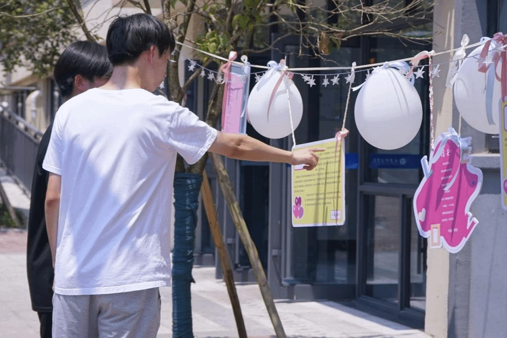 情书展示活动前,文学社的成员们在社团指导老师萧婷婷的带领下分别在三个活动现场布置场地,即图书馆广场、二号楼中庭、一号楼前。成员们将这100份情书作品挂起并用丝带和气球装饰,当有微风吹来时,情书作品与丝带、气球随风飘扬,在校园里形成了一道美丽的风景线。情书吸引了不少路过的同学驻足观看,谈着恋爱的情侣们更是握紧了双手,体会着每一份不同的爱意。
