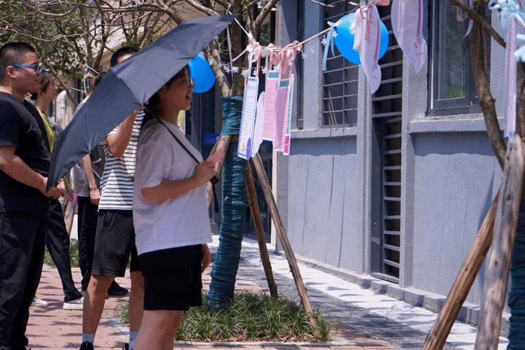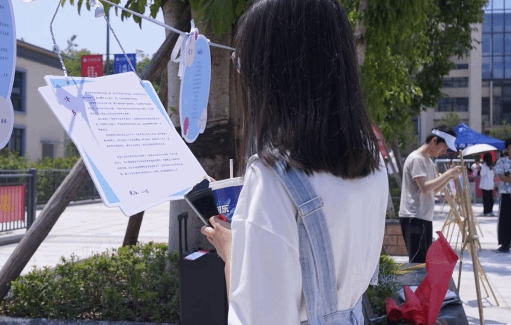 下午13:00,活动正式开始。萧婷婷老师陪伴着工作人员顶着热情的太阳,与大家共同感受着同学们身上洋溢的青春气息,共赏爱情在文字里的美好。参加活动的同学们早早的就来到了活动展示地点之一的图书馆广场,三三两两作伴,面对情书低声呢喃,远远观之,像是时间被按了暂停键,只留一个温馨的下午为看画的人守候。工作人员在每棵树之间都挂上了美丽的丝带,并在丝带上绑上了带有星星的气球和情书作品,在那里观看的同学中有一位短发的女孩让人印象深刻,她在一个名为《无言》的作品前驻足许久,曈光逐渐暗淡,眼泪无声滑落,或许对她来说掉过的每一滴眼泪都是我爱你最大的诚意。