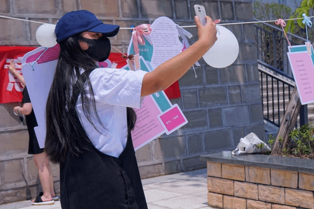 不少情书的作者更是亲自带着室友、朋友来看看精美制作出的情书展板美美的“炫耀”一番,看着自己的作品在室外向众人展示,心中的喜悦溢于言表,他们相互拍照留影,记录这令人难忘的美好校园时光。