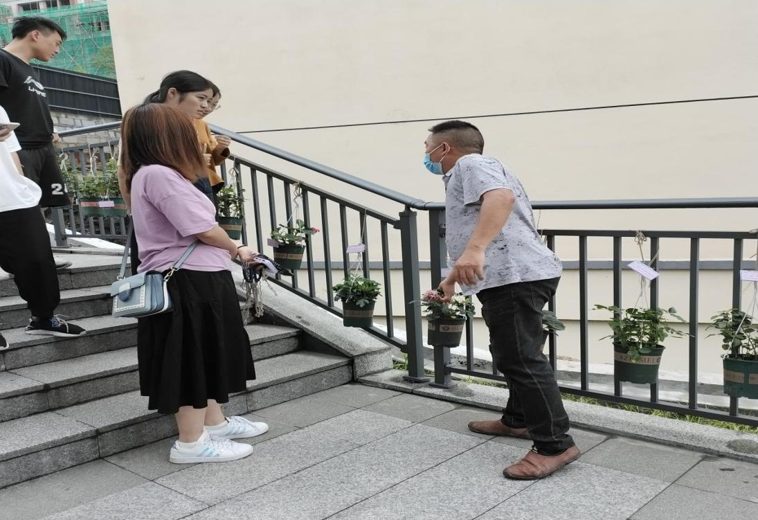 在花卉还未开始“成廊”前,由花卉协会临时负责人们为同学们派发定制好的领养信息板,将它们悬挂在相应的花卉上,并且为大家讲解了该如何养护这些盆栽。在盆栽领取过程中大家需要将花盆用钩子勾起来,一开始同学们都不太会操作,后面经过负责人的讲解和教授后,同学们慢慢的掌握了方法并且能熟练的挂了上去。