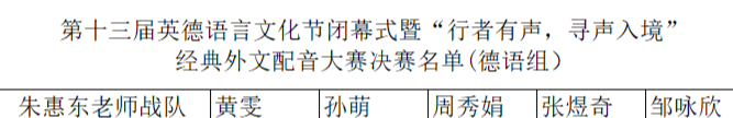 经过两个小时的精彩的角逐,本次复赛英语组共晋级十五名选手,德语组共晋级五名选手。让我们一同期待决赛现场上他们的风采吧!