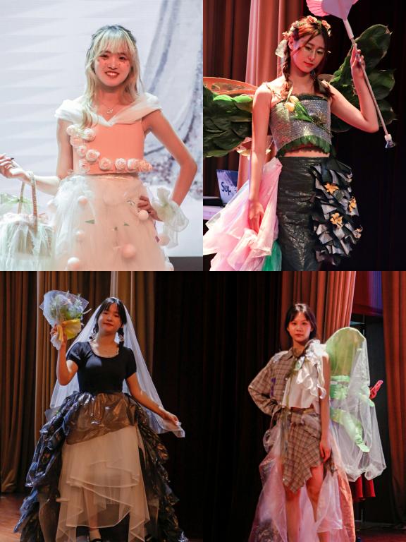 公主小妹队以破茧成蝶为设计理念,她们用旧衣物为主体,用纸板、塑料瓶、网纱等材料加以改造,不规则的旧衬衫体现出破蛹之路的崎岖,身上用塑料瓶制作的蝴蝶寓意着重获新生的绚丽;啊不不不不不队将废旧蚊帐化为飘逸纱裙,点缀上用纸巾折叠出玫瑰花,尽显温柔与优雅;三缺一凑齐了队的模特化身守护森林的小精灵,他们将绿色元素贯穿在花环、发型、妆容、服装、配饰等各个方面,于是森林的春意便从模特身上流溢出来,天真烂漫、灼灼其华;稀奇古怪队将我校社团活动荷塘文化节中的荷叶、荷花、莲蓬等元素巧妙融入到设计里,用纸板和破布制作的荷叶作为披肩,废旧布料和网纱制作成荷花作为裙身,成熟的莲蓬作为手持。她们的设计中将荷叶每个生长阶段展现出来,清新自然,质朴真实。