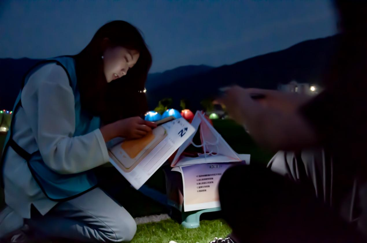 夜幕降临,随着裁判一声令下,操场上的探照灯关闭,操场内陷入黑暗,同时充当障碍物的帐篷里泛着柔光的相继被点亮,星星点点分布在操场上,散发着神秘的气氛。随着活动的开始,参与小组分批次出发,操场上充满了紧张刺激的氛围。