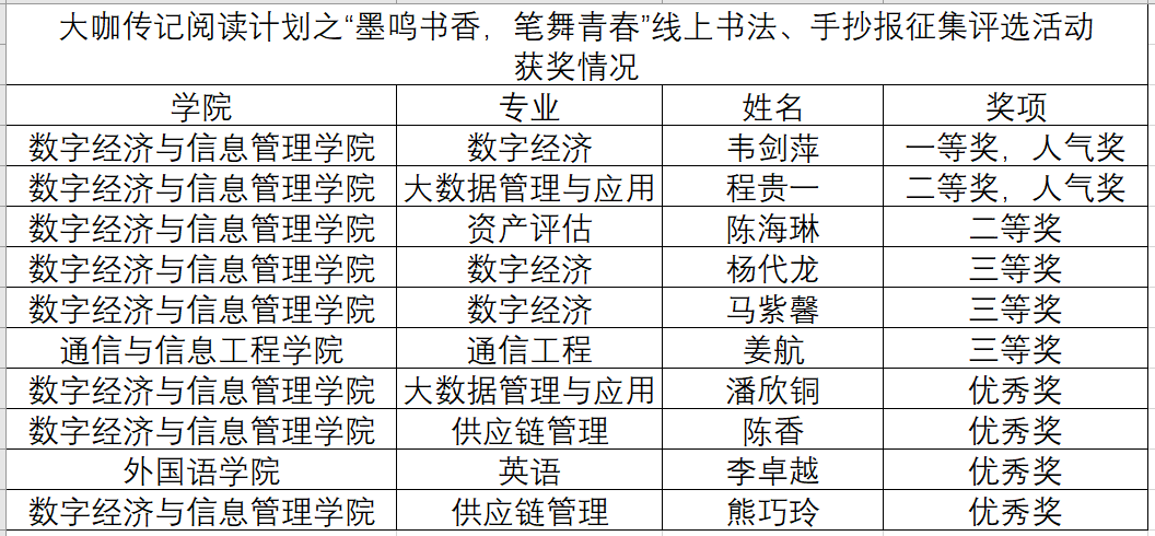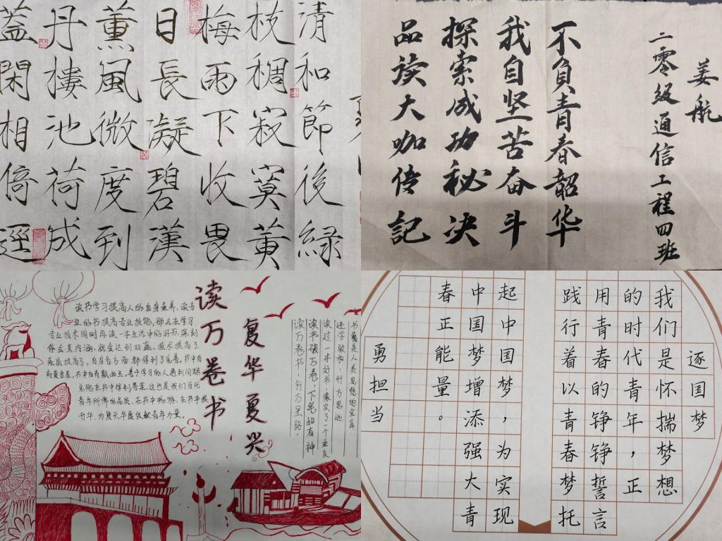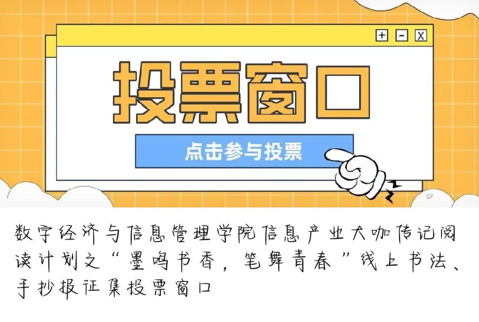 为进一步贯彻我校“信息产业大咖传记阅读计划”,弘扬中华优秀传统文化,促进校园文化建设,营造更好的读书氛围,构建和谐校园,数字经济与信息管理学院于5月18日举办大咖传记阅读计划之“墨鸣书香,笔舞青春” 线上书法、手抄报征集评选活动。本次活动将评委打分与大众投票相结合,择优选出10份作品进行表彰。
