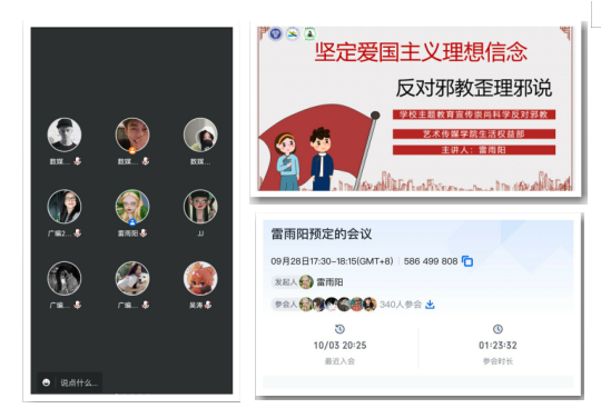 为弘扬爱国主义精神、深入揭露邪教,弘扬正气,让大学生坚定爱国主义信念,提高大学生识邪、防邪、拒邪的意识和能力,筑牢高校反邪教意识形态阵地,为党的二十大胜利召开创造和谐稳定社会环境。2022年9月28日艺术传媒学院生活权益部,在南湖书院智慧教室106,举办“坚定爱国主义信念,反对邪教歪理邪说”宣讲活动。本次宣讲活动邀请了艺术传媒学院辅导员胡磊老师进行反邪教的讲解,并邀请我校重庆市优秀班级代表吕航和优秀班委代表李思阳两位学长进行学生工作经验的分享,活动线上、线下共计参与人数412人。