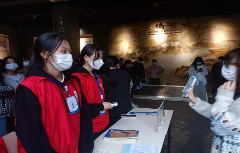 本次参观活动伊始,同学们有序地排队扫码进入博物馆进行自由参观,并在演播厅观看钓鱼城历史纪录片。钓鱼城之战是在古代防御战最浓墨重彩的一章,其中“以少胜多、以弱胜强”“改写欧洲篇章”一系列关键词,更是为这一攻防战之地添上几分恢弘。随后由讲解员杨正芳带领同学们到一楼展厅了解钓鱼城守将王坚将军守城抗战36年的英雄事迹,以一己之力联合钓鱼城所在地的居民,共同以坚强意志抵抗外敌。