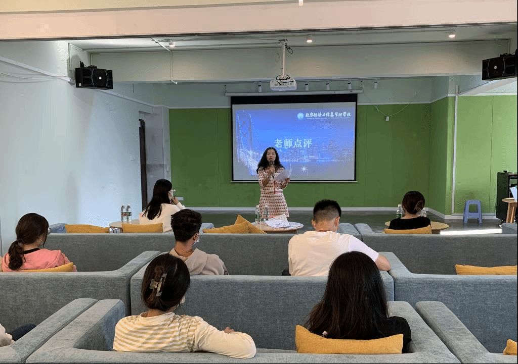 各组展示完毕后,进入统分环节,此时由张红老师上台致辞。张红老师对每个小组的作品进行了细致的点评,对未能进入决赛的作品给出改进建议及鼓励,也让参赛选手们更系统化地认识到自身作品的优点与不足之处。还表达了对比赛的高度重视和支持,鼓励同学们使用多样化的方式和熟练运用绘图软件来表达自己的设计思路、想法、风格,来展现出自己优秀的作品,同时希望进入决赛的各小组选手能互相学习,吸取经验。