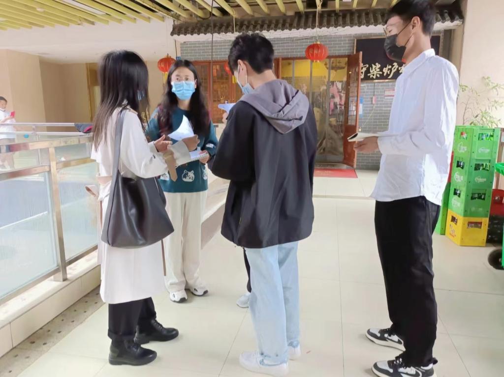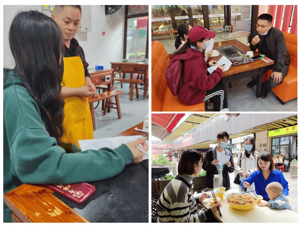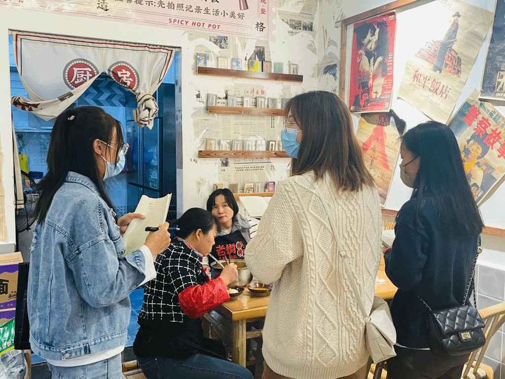 为将商科思维与实际走访调研相结合,更加真切地了解当前餐品行业的发展状况和趋势,提升商院学子的洞察能力与沟通能力,帮助大家未来更好地就业和创业,淬炼·国际商学院(綦江校区)就业助理团干部和2021级工商管理类1-3班学生代表在专任教师李俊颖老师、唐秀英老师、朱应霞老师以及辅导员肖琳老师的带领下,于2022年10月28日12:30在綦江区红星国际广场开展了以“淬炼踏‘綦’乡·寻味访百商”为主题的关于“餐品”的走访百商活动。