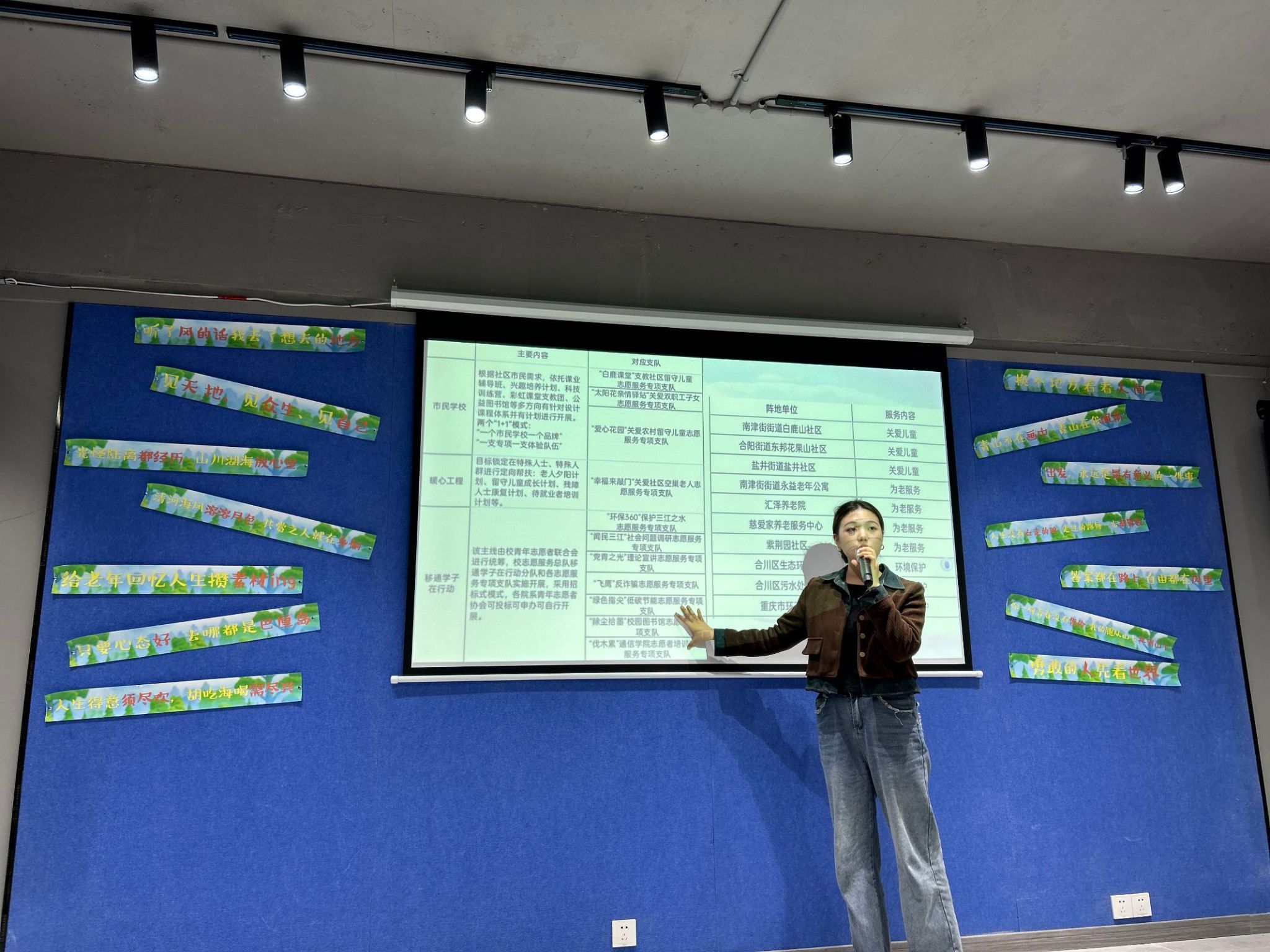 活动伊始,由通信与信息工程学院青年志愿者协会学生副书记毛凤鑫为大家介绍各专项支队,讲述学院“一体三翼”绿色志愿服务体系具体内容。由“爱心花园”关爱农村留守儿童志愿服务专项支队指导老师龙涛老师做活动内容讲解,她提到要将志愿服务与社会服务相关联,应将部分侧重点放在社会服务项目上。