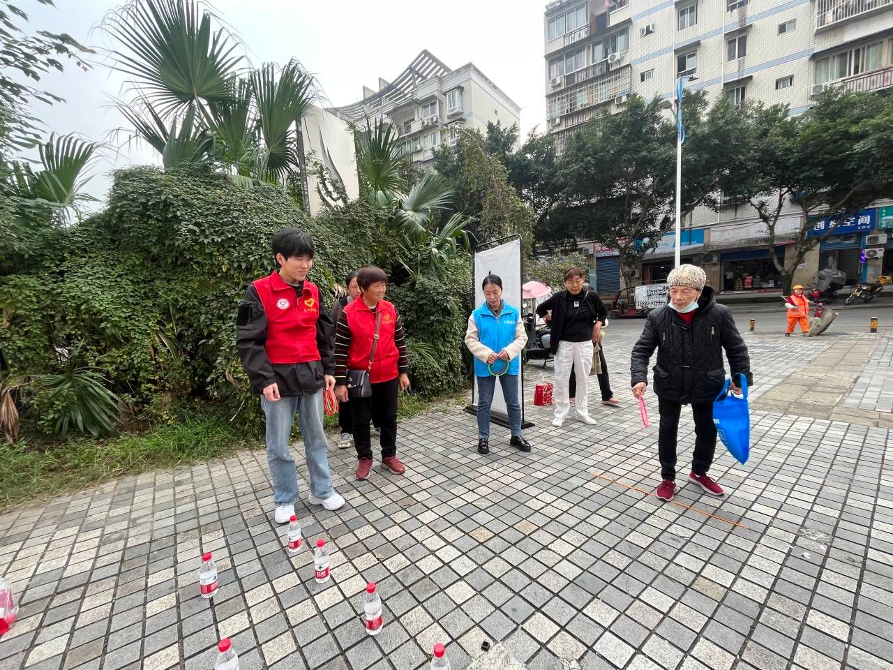 在健康体检区外还设有游戏互动区。在小游戏中,志愿者们和社区工作人员积极辅助社区的老年人和残障人士制作向日葵和小发卡等小手工,志愿者们耐心地向大家讲解向日葵的制作步骤,并带领老年人和残障人士们一起玩套圈小游戏,大家都融入其中,相处融洽,整个制作和游戏过程充满乐趣。