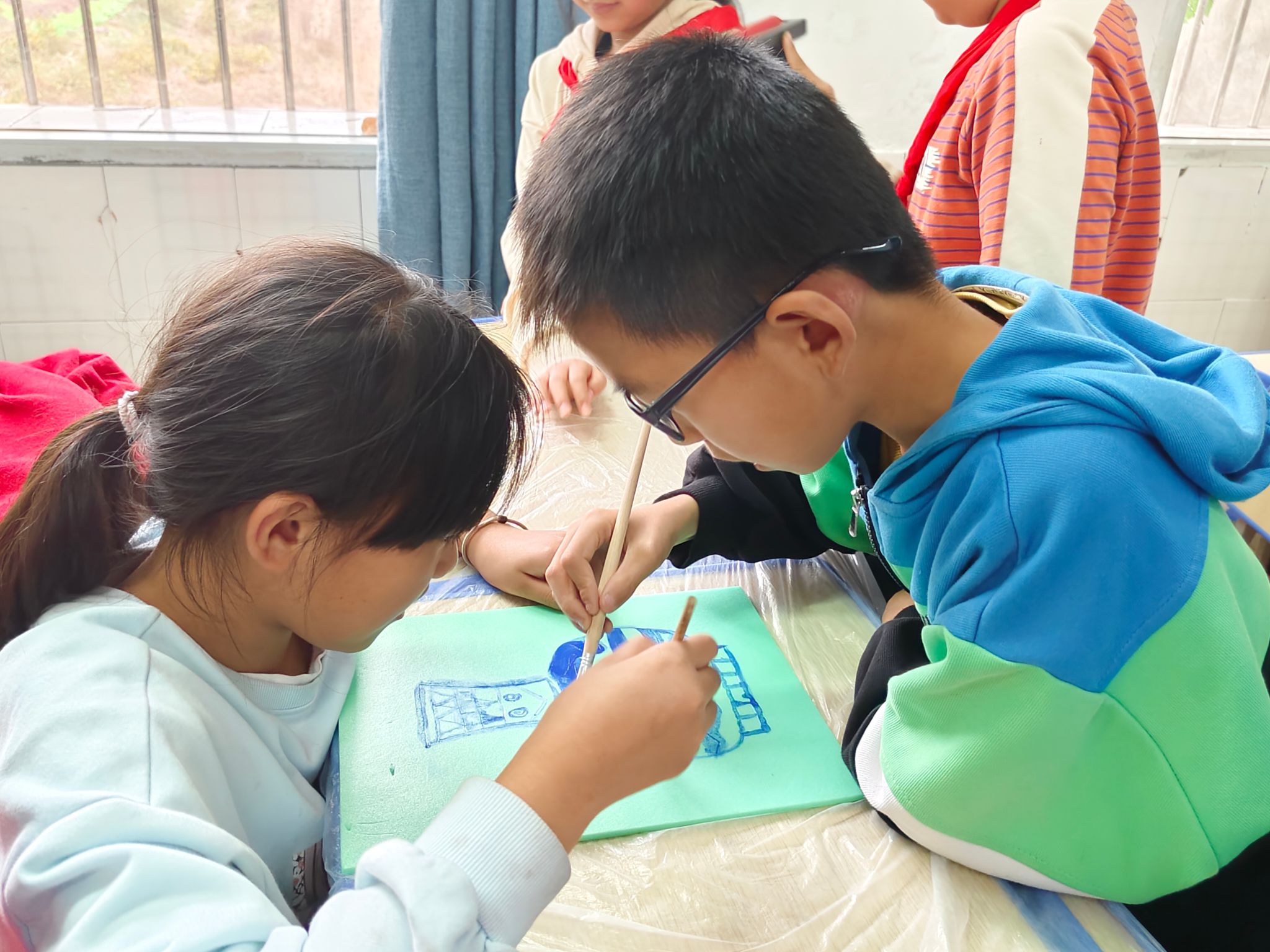 志愿者们组织小朋友们制作版画,以保证在青少年群体中普及版画知识的同时,也给孩子们一个展示自我的艺术平台。志愿者们都耐心的跟小朋友讲解如何制作版画,并积极尝试制作,小朋友都将自己的想法融入版画与的制作中。他们与志愿者认真学习如何动手制作版画。经过雕刻、上色之后,他们将其印在纸上,俏皮的图案伴随着灵动的颜色,一幅色彩鲜明的儿童版画就呈现在我们眼前。小朋友们看着印刷出来的成功,脸上溢出笑容。