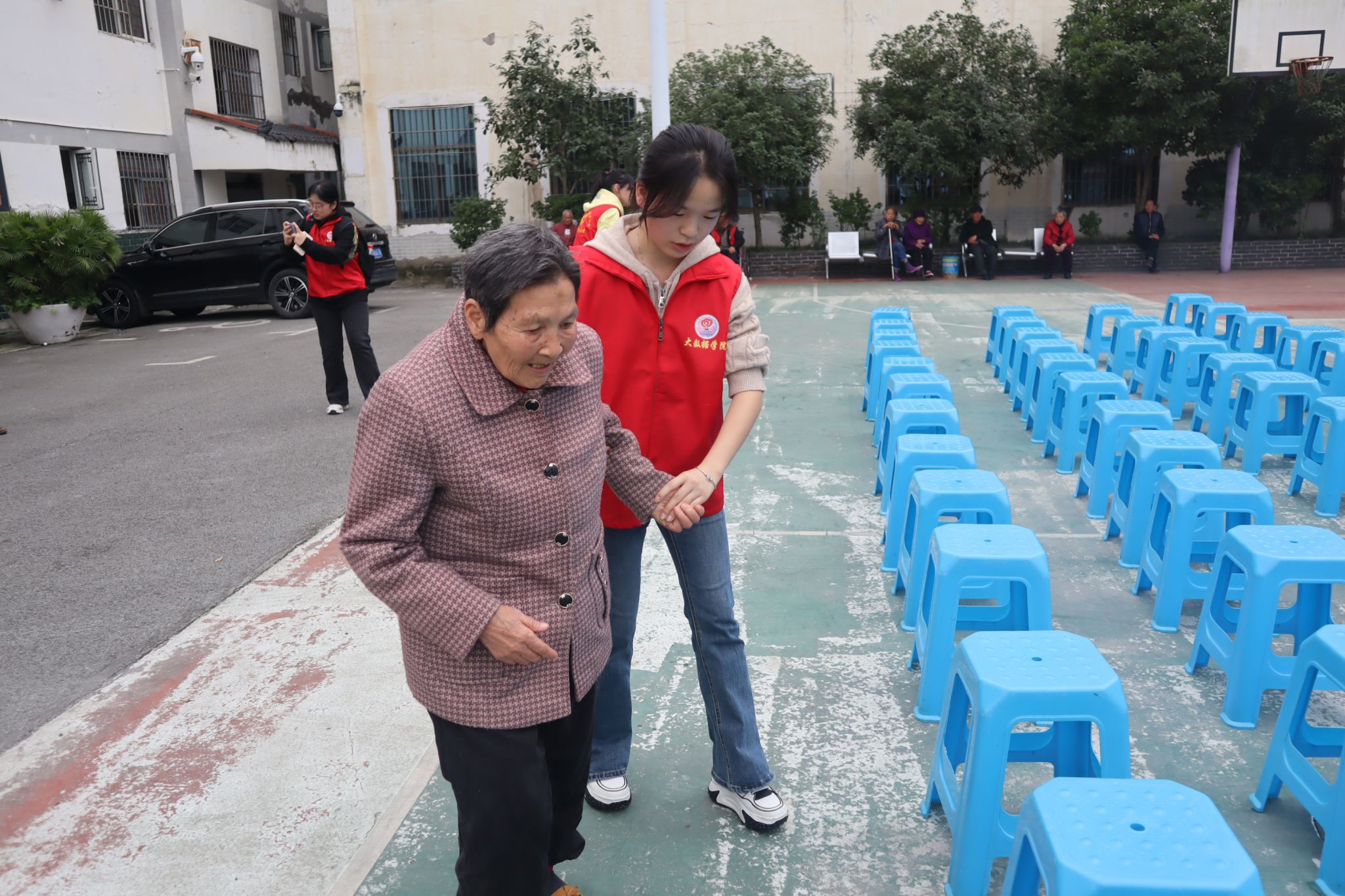 在老人们看节目表演时,志愿者们走到老人身边,为他们锤锤腿、按按肩,与他们畅聊家常。节目以一首大家都耳熟能详的歌曲《最炫民族风》开场,一个爷爷听到音乐后,主动走到台前与志愿者们一起唱歌、跳舞,赢得了在场所有人的热烈掌声。休息期间志愿者们为老人们准备了小游戏——击鼓传花,这个小游戏对提高老人们的反应能力有很大的帮助,同时也调动了活动现场的气氛。游戏环节中老人们展示了自己的歌唱和舞蹈,幸福的笑脸,一曲曲情真意切的歌,一支支韵味十足的舞,一句句沁人心扉的诗……被定格在这个凉爽的下午。志愿者们用实际行动将敬老之心、传孝之道展现得淋漓尽致。