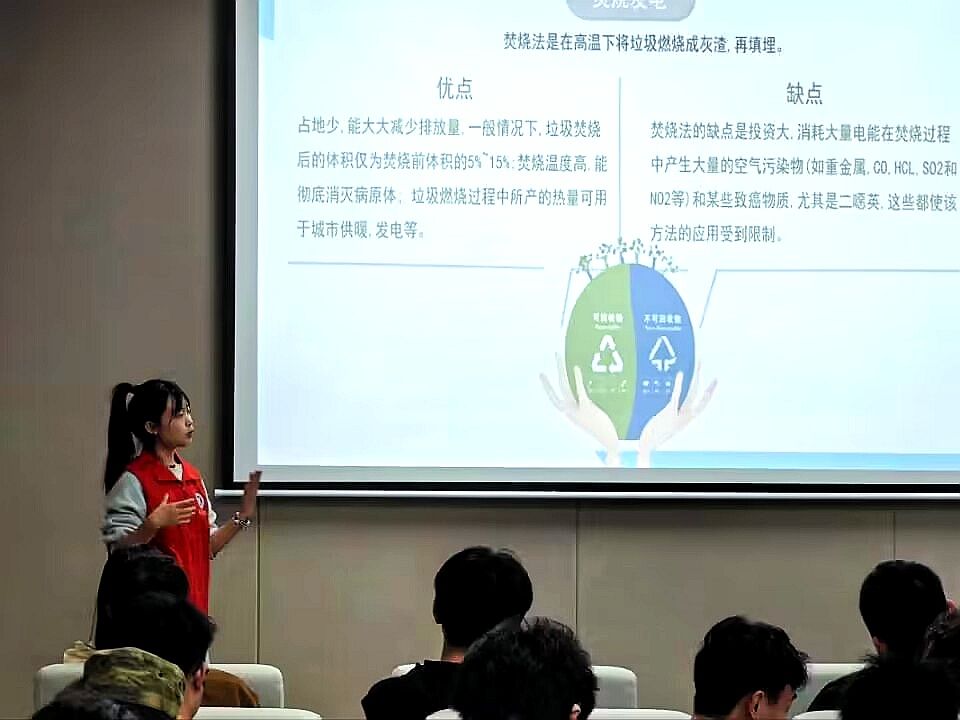 习近平指出,绿水青山就是金山银山。保护生态环境就是保护生产力,改善生态环境就是发展生产力。为了带领同学履行分类义务,承担社会责任,普及同学们的垃圾分类的知识,号召各位同学在日常生活中养成垃圾分类意识。11月10日下午,綦河卫士”节水护河志愿服务专项支队的志愿者来到瀛溪书院潜台词影音室向同学们进行“让垃圾回家,共迎绿色家园”--绿色环保宣讲活动。