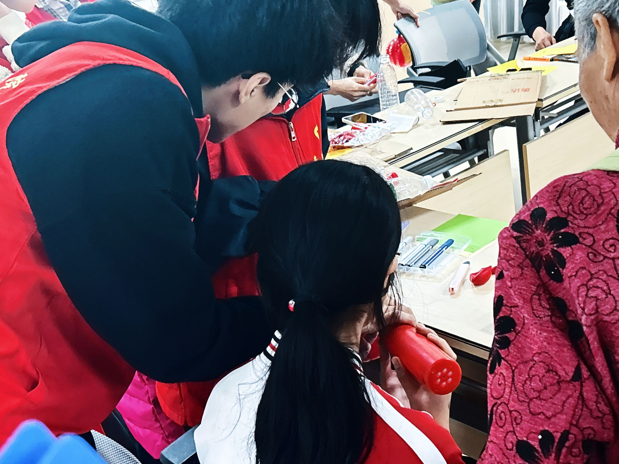在阵阵欢声笑语中,本次活动圆满结束。在轻松愉快的氛围中,小朋友们通过自己奇特的想象力和创造力,将日常生活中随处可见的物品变成一件件独特的作品。每一个作品看似简简单单,但都是小朋友们用心浇灌的结果,承载着小朋友与家长之间美好的回忆。秋日花黄叶落,冬日寒风瑟瑟。朵朵花儿绽笑脸,满室春暖花开。奉献于心,志愿同行,小小的活动室里充满了温情与爱,这就是志愿的意义。