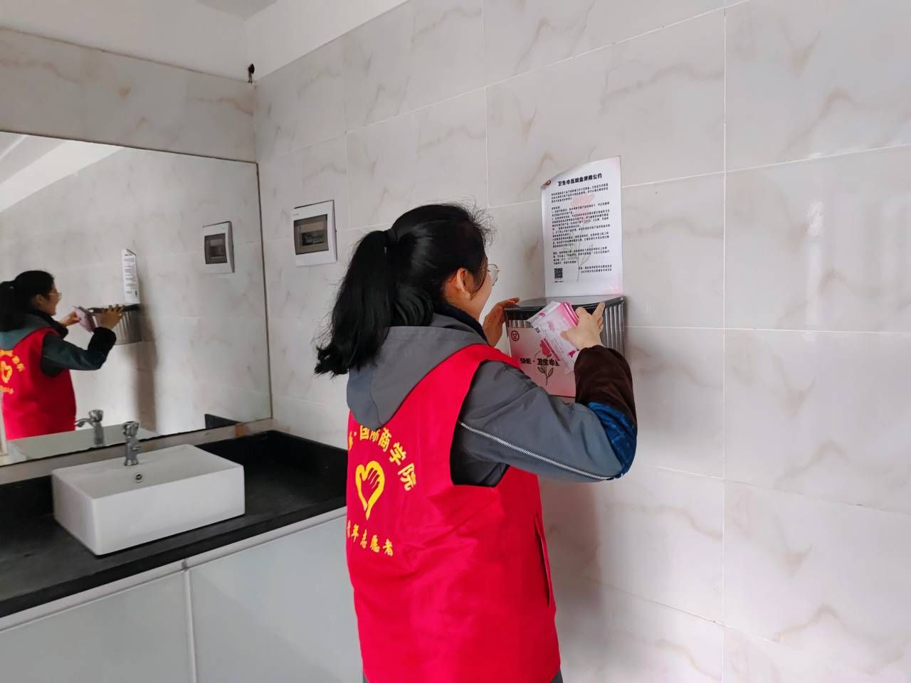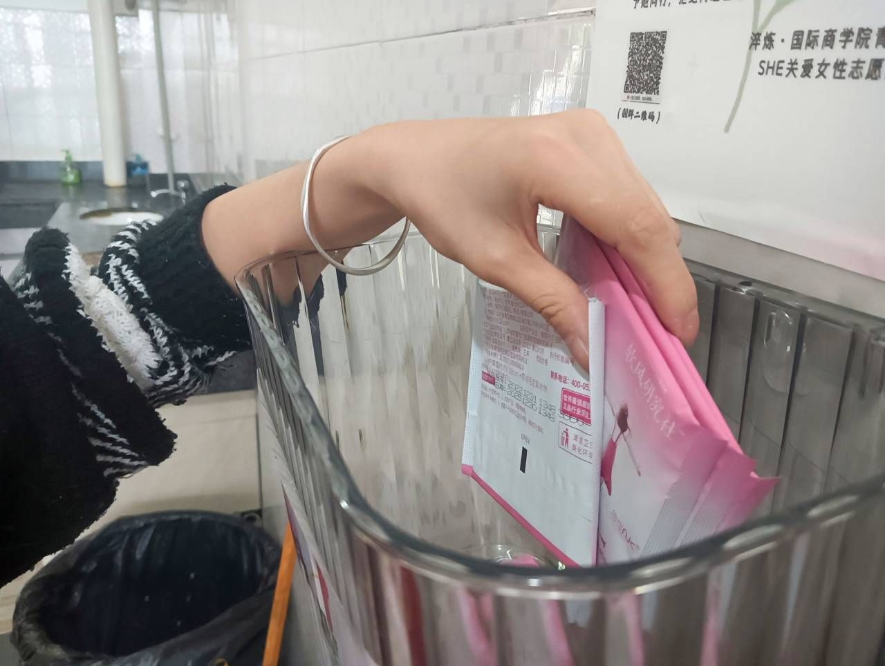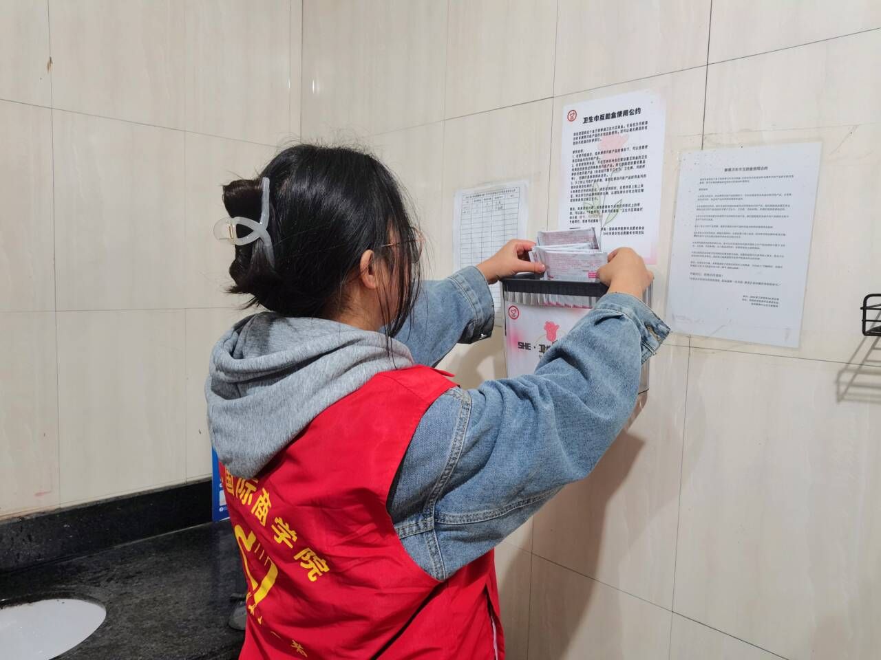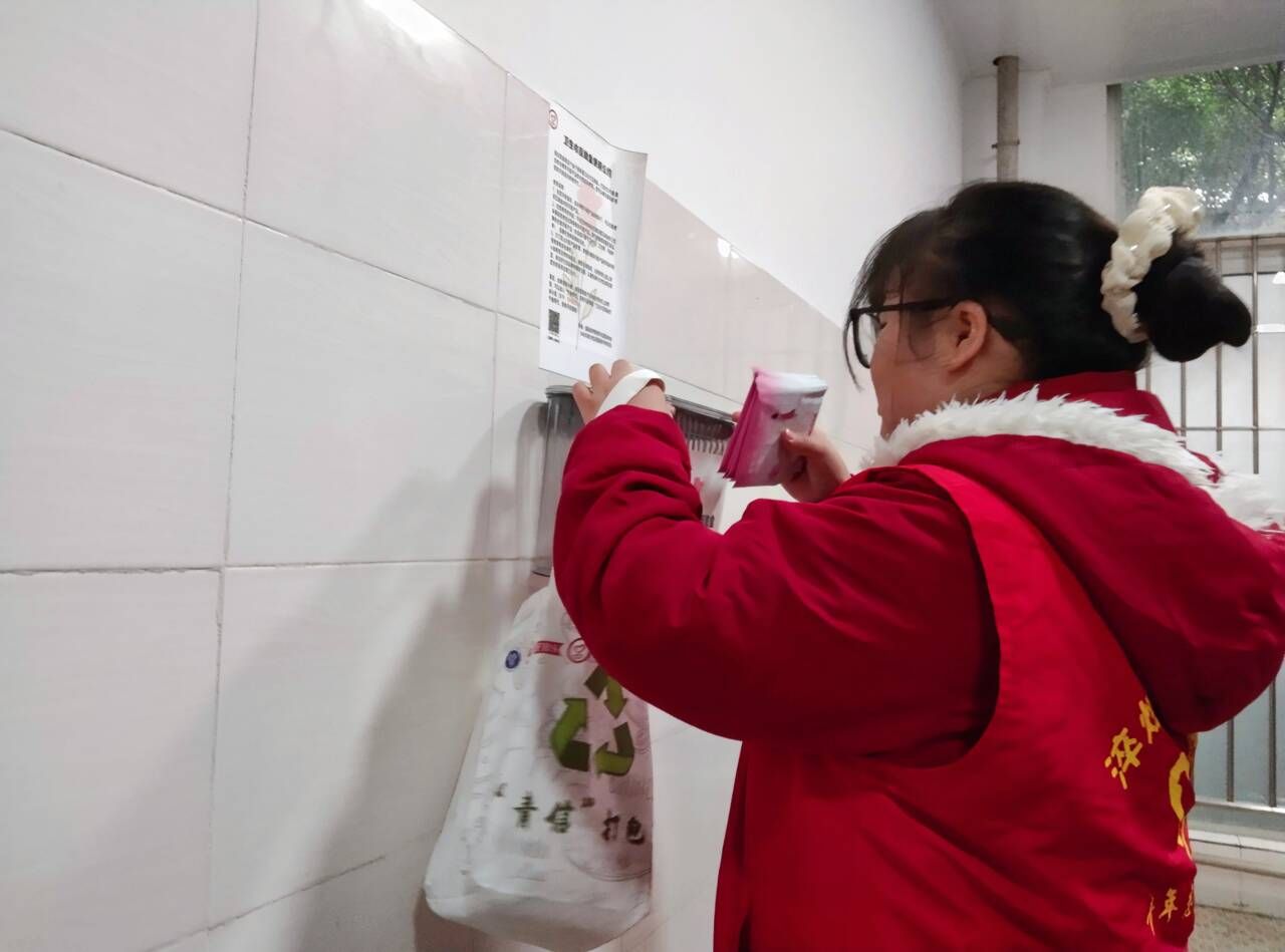 为了让女生在面临突如其来的月经时不会感到尴尬,在全校营造关爱女性的良好氛围,提供特殊时期的特殊保护,让女性月经期间感到温暖,安心度过每一天。重庆移通学院淬炼商学院青年志愿者协会“SHE”关爱女性志愿服务专项支队于11月15日在南校区开展了卫生巾补充活动。