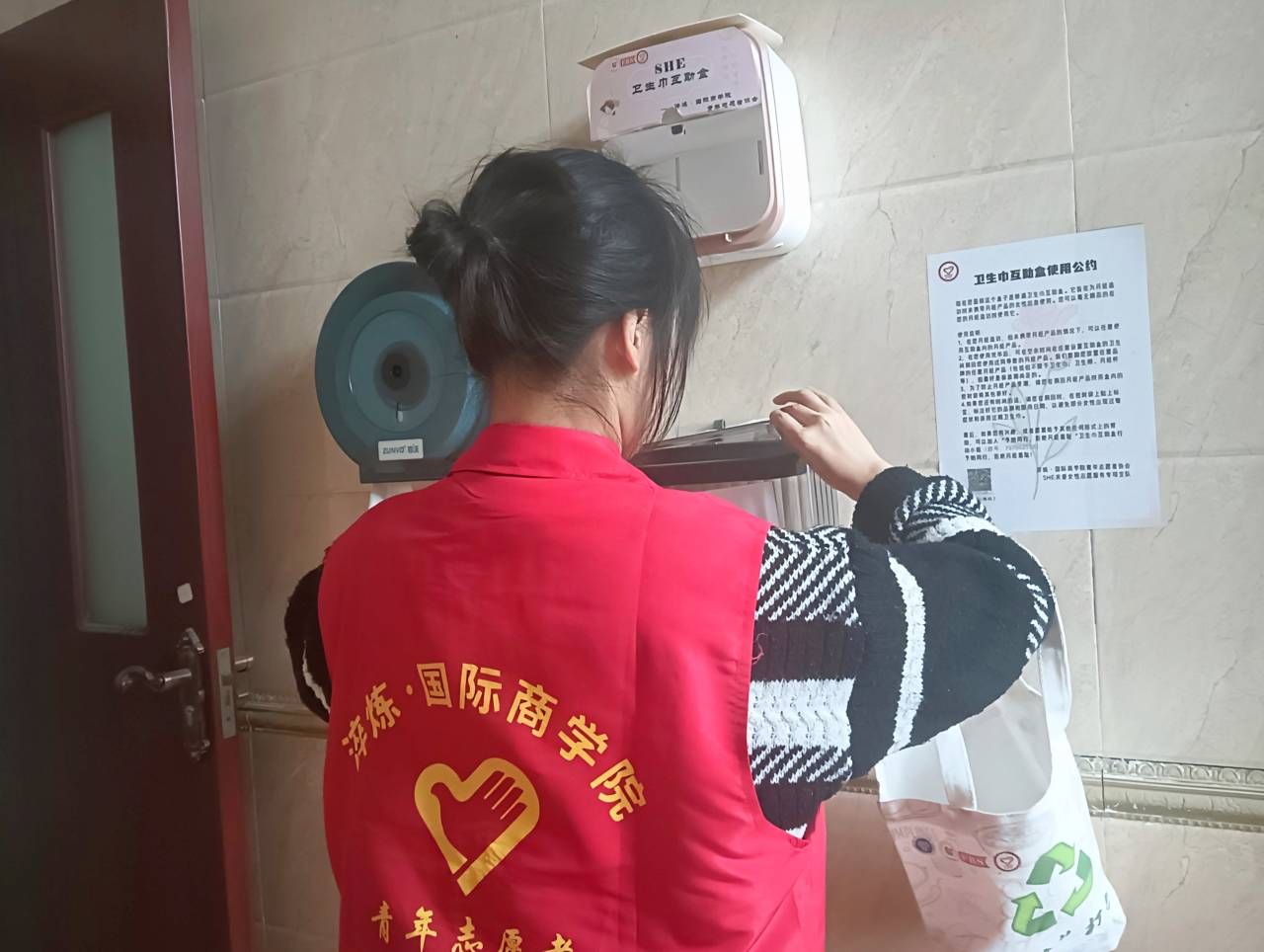 卫生巾互助盒能够帮助女性生理期突然来临的小尴尬,给生理期来临的女性提供了温暖和帮助,女性是一个整体,呼吁广大的女性朋友们互帮互助,让更多的女性以及男性朋友们都能够正视月经,为女性营造一个更加平等开放的社会环境,让女性更加自信、自在地面对月经。关爱女性,淬炼商学院青年志愿者协会“SHE”关爱女性志愿服务专项支队从不缺席。