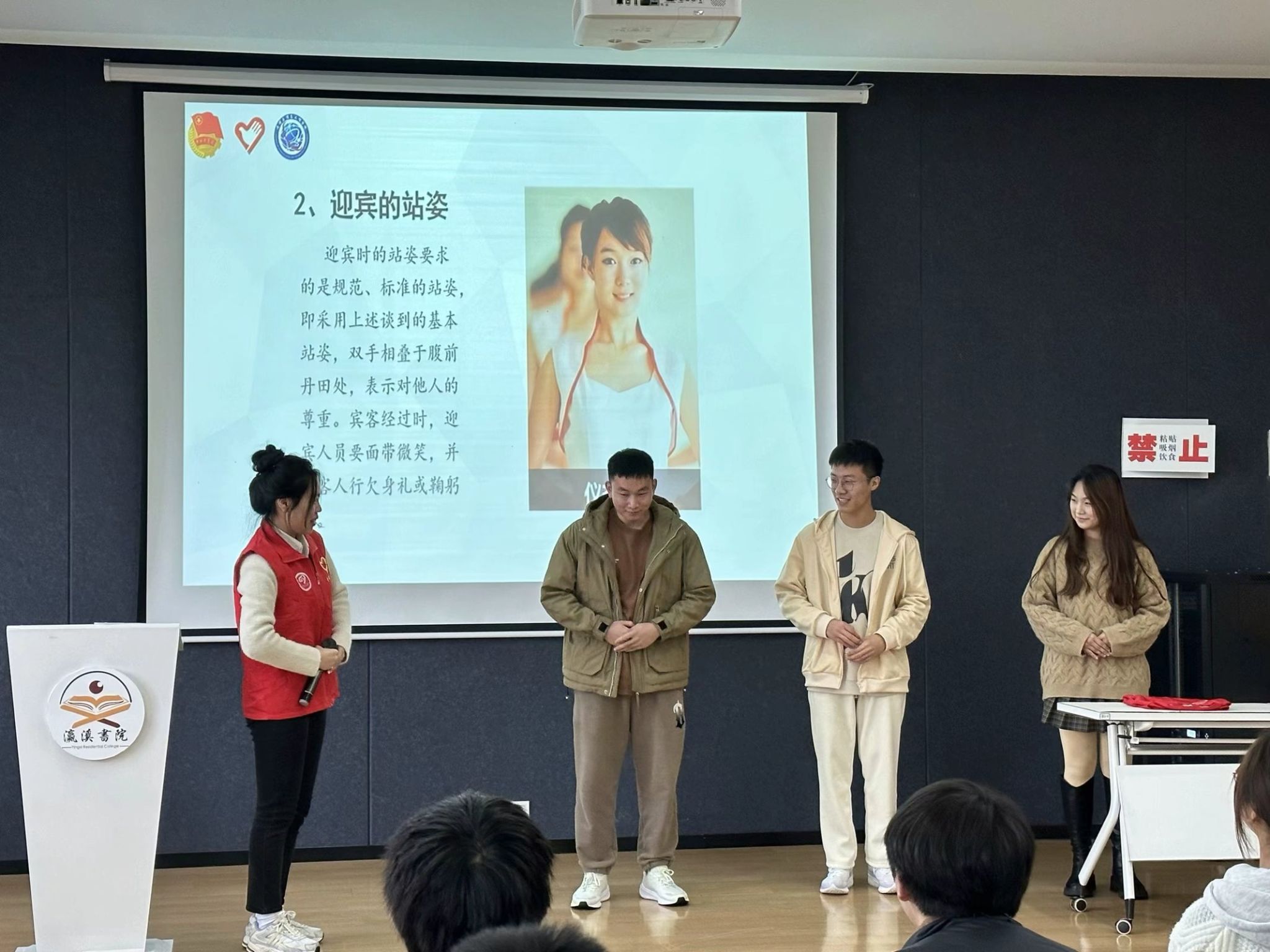 在仪容礼仪与仪态礼仪方面,陈佳琳同学告诉志愿者们仪容仪态是志愿者在服务过程中人们对志愿者的第一映象,端正的仪容仪态有利于志愿服务更加深入人心,提高志愿服务效率。随后,陈佳琳同学从基本的站姿、走姿、鞠躬礼、握手礼等方面进行了详细的讲解和示范。并邀请台下的志愿者们上台展示,在站姿方面,陈佳琳同学强调志愿者们应该保持挺胸、收腹、目光平视,面带微笑,给人以亲切、友善的感觉。在走姿方面,提醒志愿者们要保持步伐稳健、自信,避免过于匆忙或懒散。在鞠躬礼和握手礼方面,陈佳琳同学强调了礼节的重要性,并详细介绍了正确的动作要领。