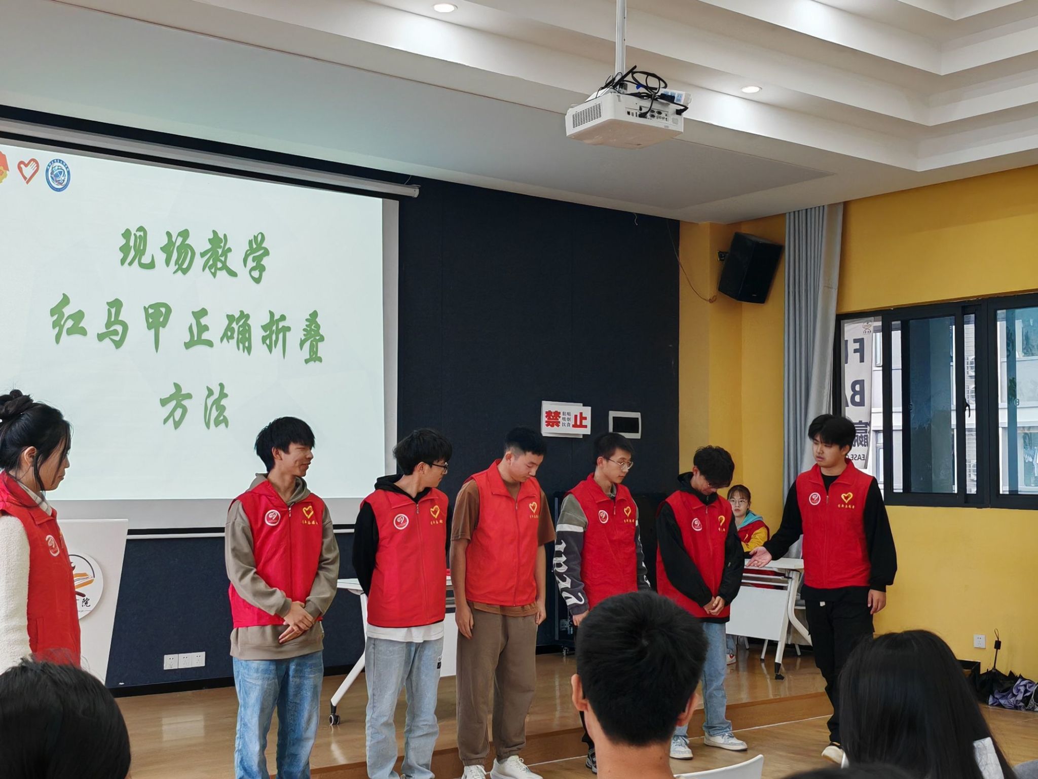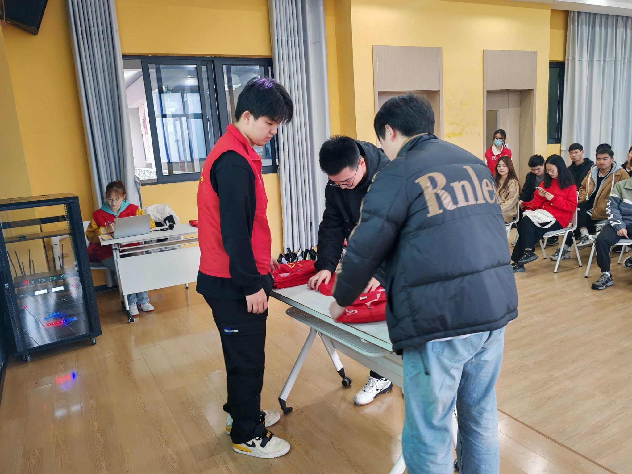 最后是服饰礼仪方面。陈佳琳同学强调了得体的着装更能彰显志愿者的风采,同时向志愿者们展示了正确的穿着,并诚邀支队长吴立军同学上台向志愿者们现场教学红马甲正确折叠方法。