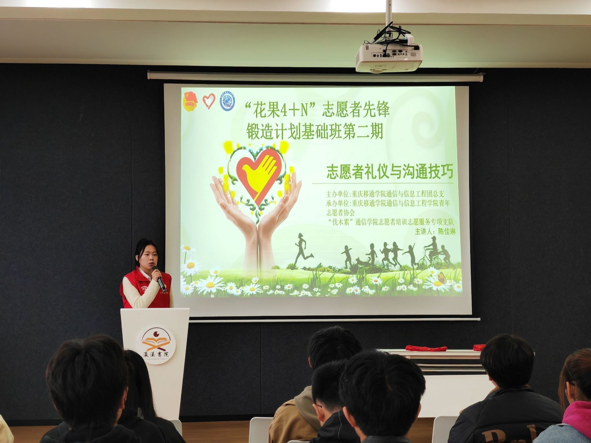 为提高志愿者的精神风貌和志愿素养,帮助同学们更好地服务于志愿活动,同时提升志愿团队整体形象,由“伐木累”通信学院志愿者培训志愿服务专项支队与通信与信息工程学院青年志愿者协会共同开展的“花果4+N”志愿者先锋锻造计划基础班志愿者礼仪与沟通技巧培训活动于11月15日星期三下午12点30分在瀛溪书院回声报告厅隆重举行。此次培训活动得到了同学们广泛的关注和支持,为后期志愿服务质量的提高打下了坚实的基础。