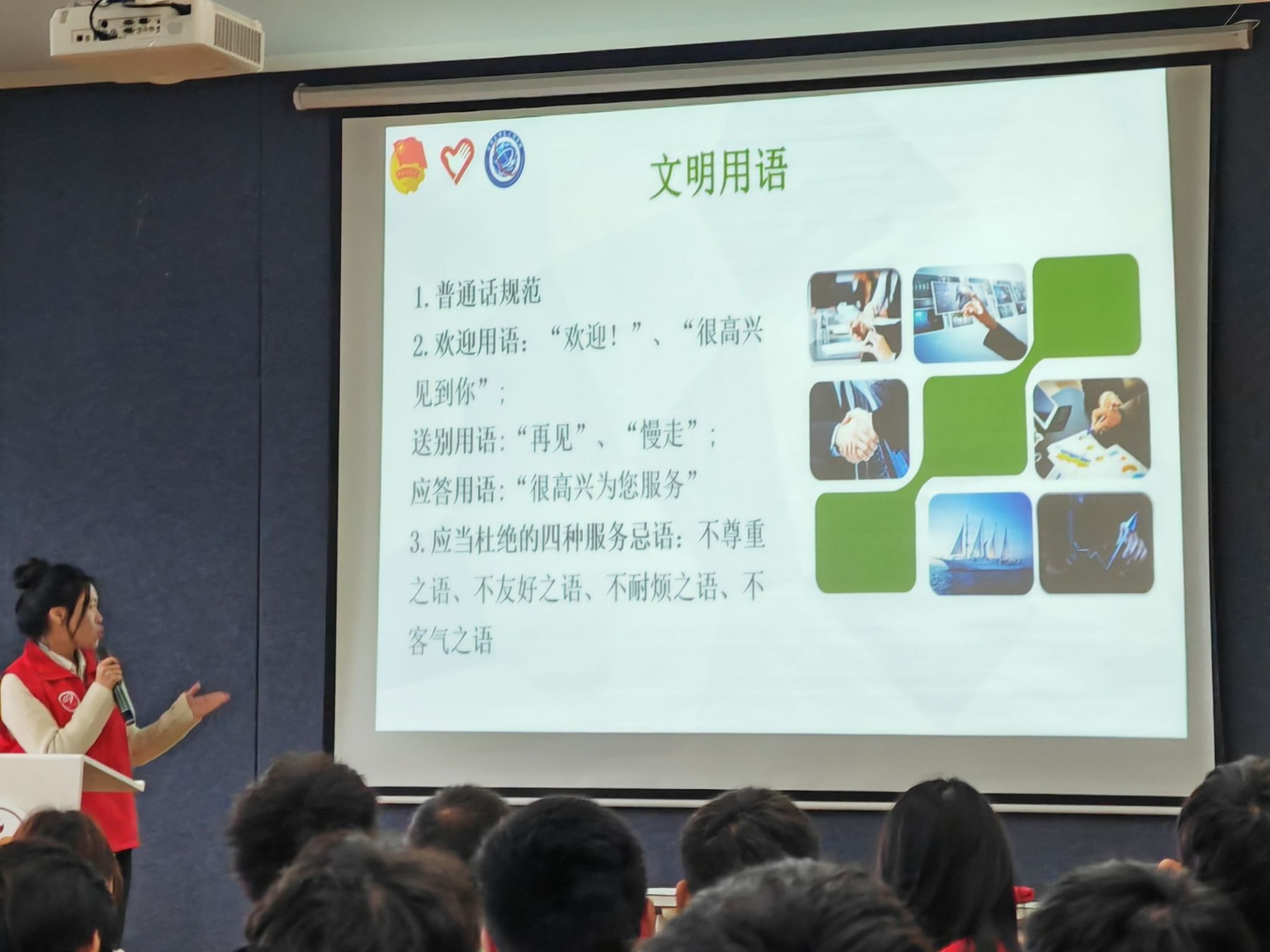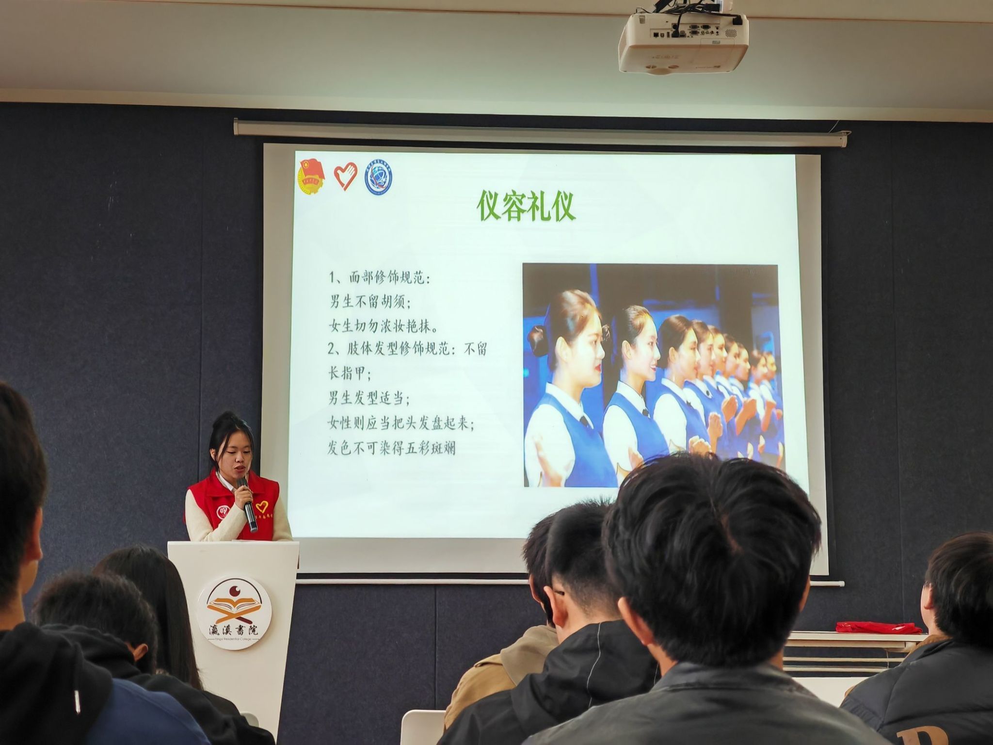 首先,由“伐木累”通信学院志愿者培训志愿服务专项支队队员陈佳琳同学向志愿者介绍了语言礼仪。她强调了文明用语的重要性,因为它不仅可以表达志愿者的善意,也可以拉近志愿者与他人之间的距离,与人交谈时保持眼神交流,尊重他人,避免打断别人的发言等基本语言礼仪。