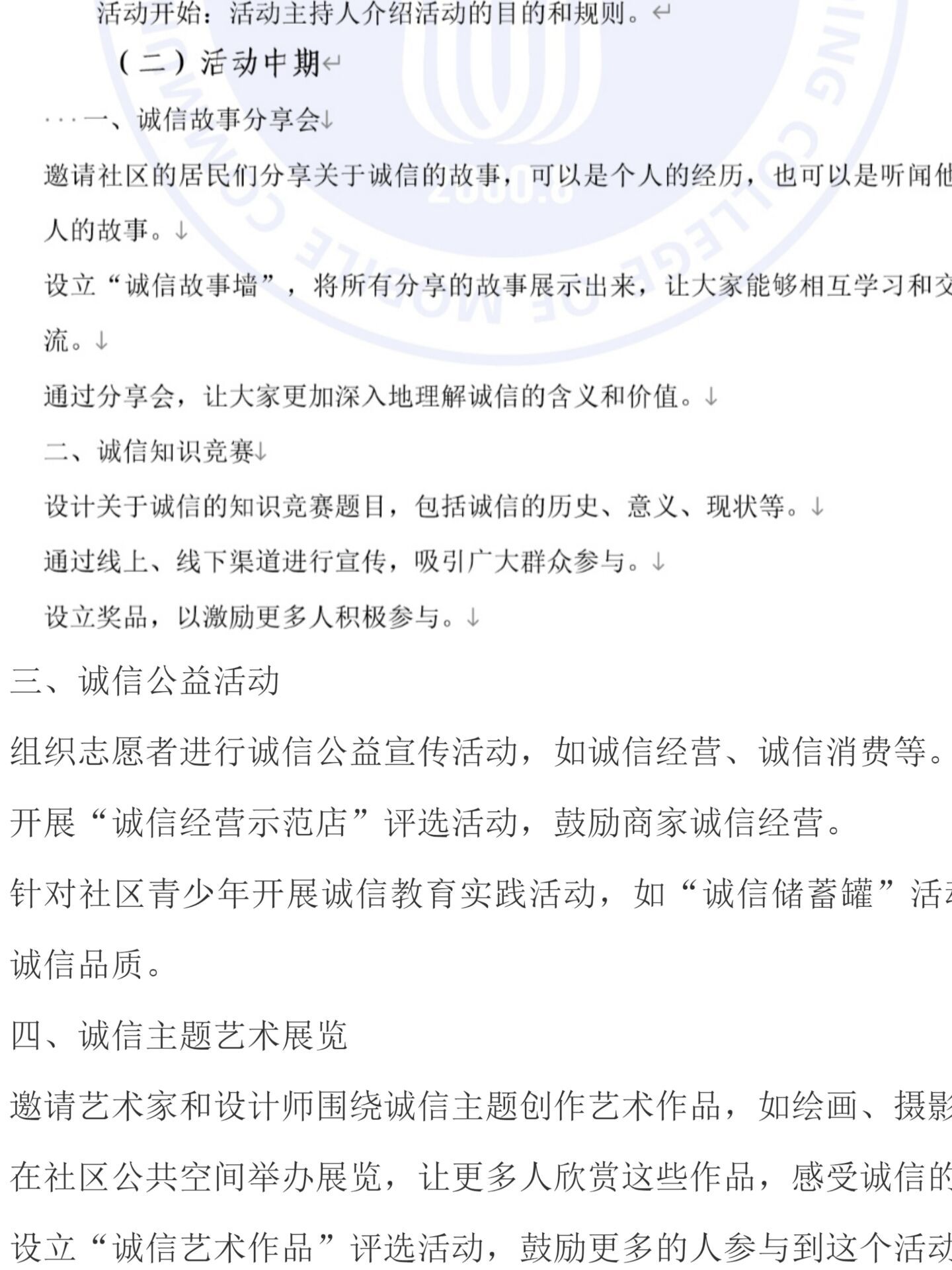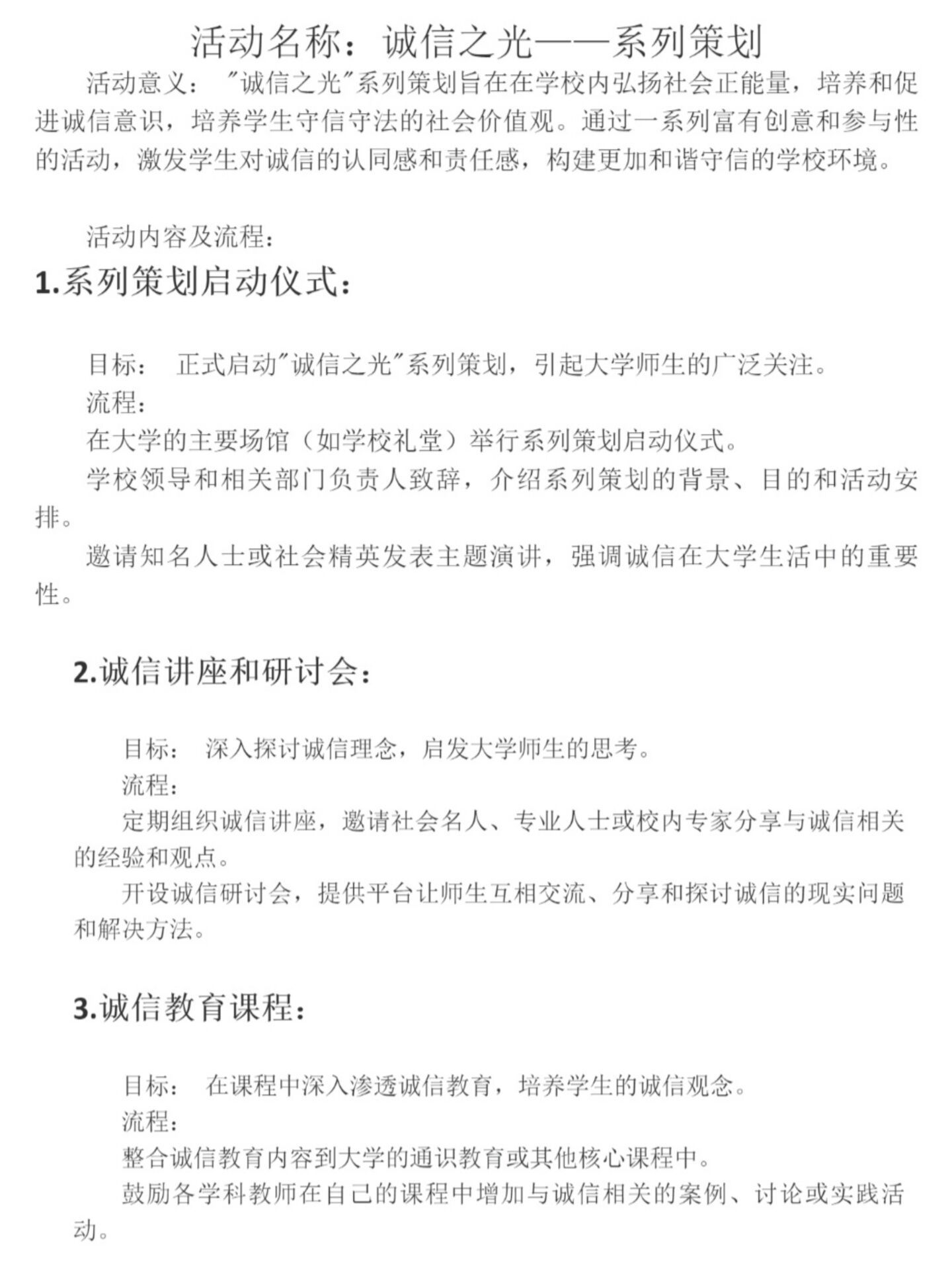 人不信于一时,则不信于一世。每份策划案反映了各个同学对诚信的理解,都有每个人独到的见解,展现了当代大学生思想的活跃,也正是这些独到的见解,思维的碰撞,为我们今后青年信用体系的建设提供了更多的可能,我们也希望通过这次活动让更多同学去感悟诚信,在未来学习生活中,我们应继续秉承诚信原则,在诚信的道路上继续前行。