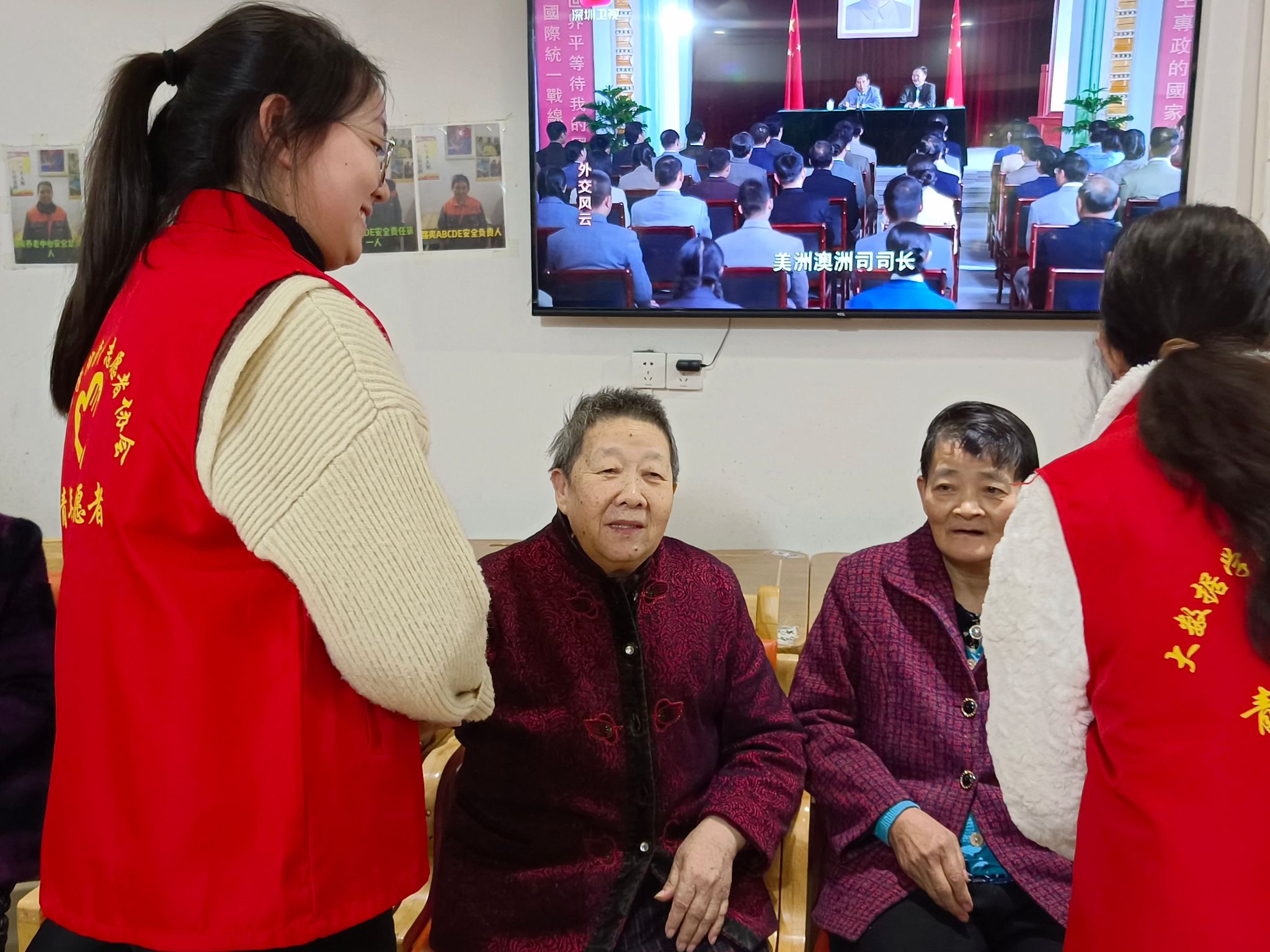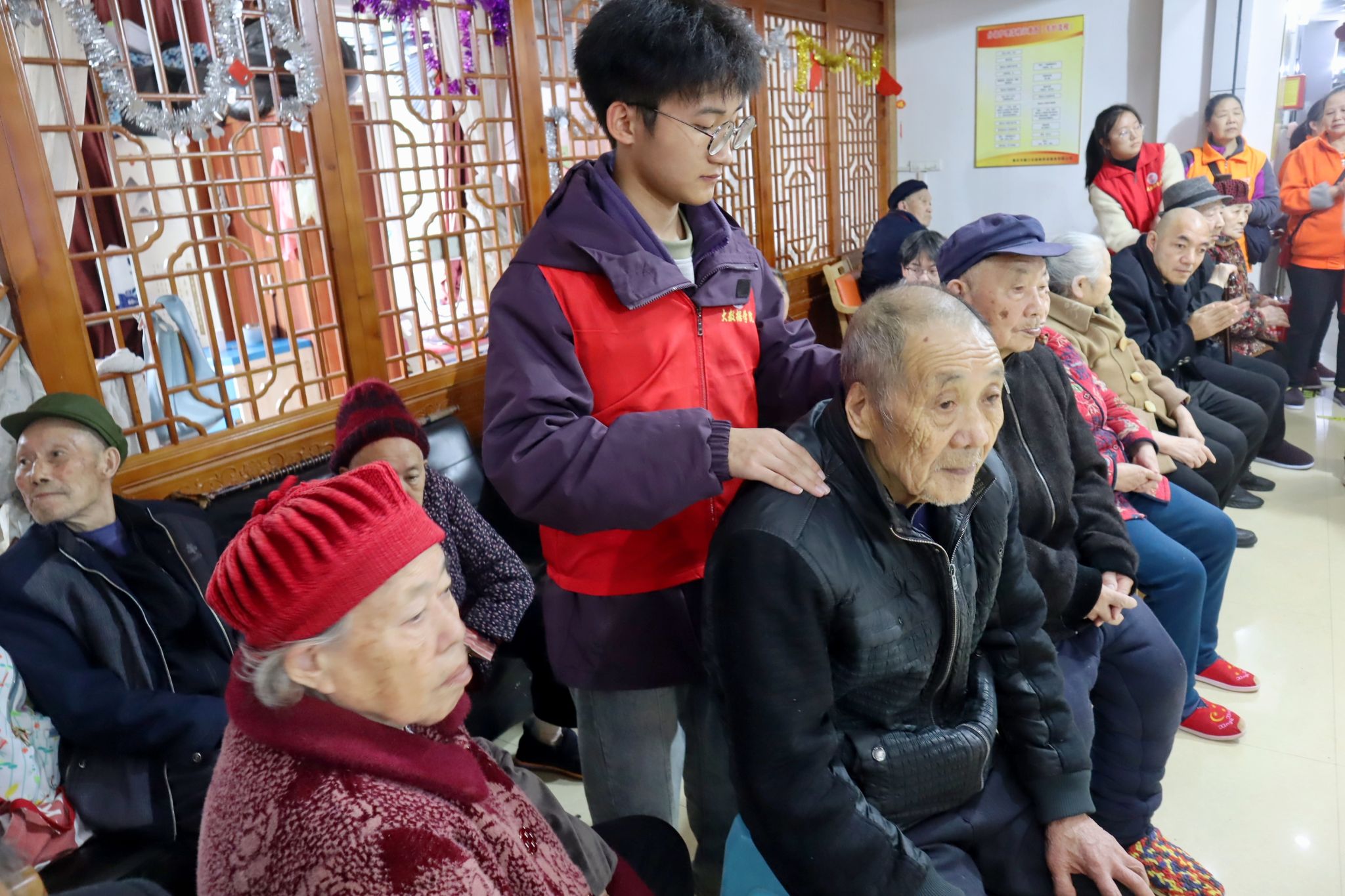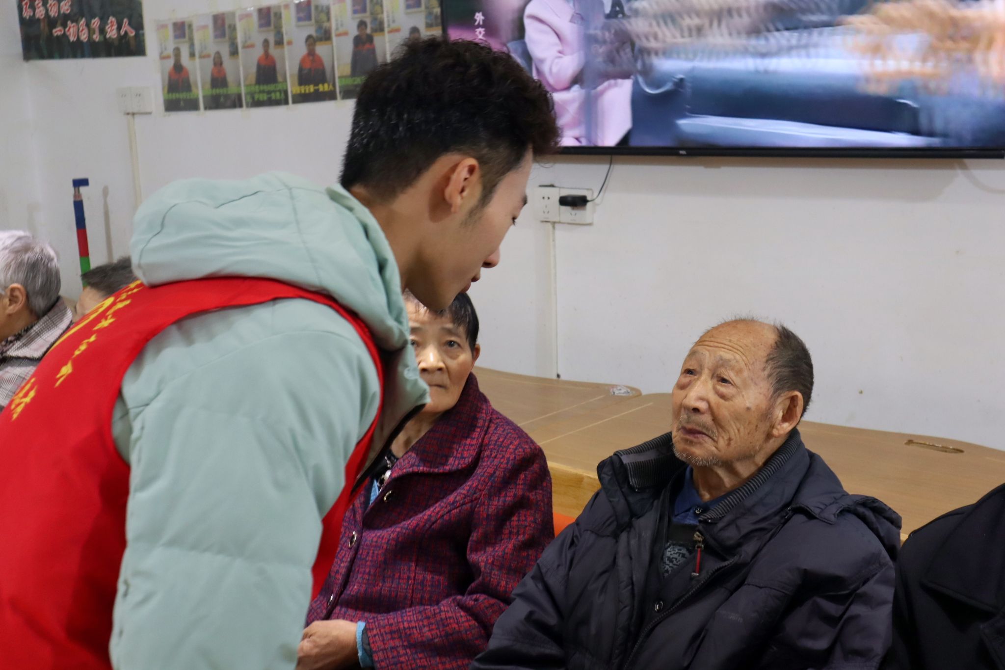 随着年龄增长,老年人的身体健康问题日益突出,因此按摩成为了一种重要的身体保健方式,老人们一边观看节目,志愿者们一边为老人们按摩和他们聊天。这不仅让他们感受到身体上的轻松与愉悦,更是一种对身心健康的关爱。老年人们在专业的指法中放松身体,释放压力,缓解他们的身体疲劳和不适,让他们感受到身心的舒适和放松,尽情享受来自志愿者们的关怀。