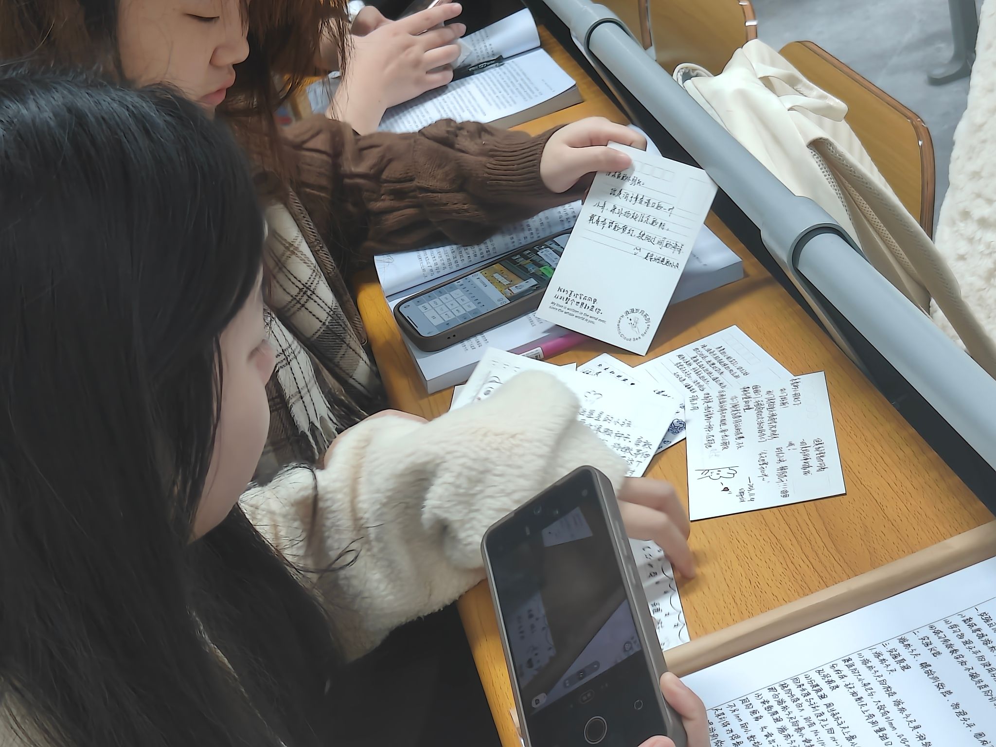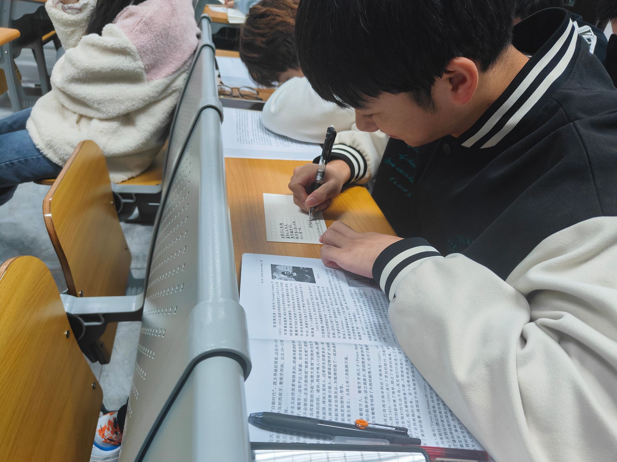 11月14日早上,通信与信息工程学院全体同学在教室里为陵园小学三年级五班的小朋友们写祝福贺卡。