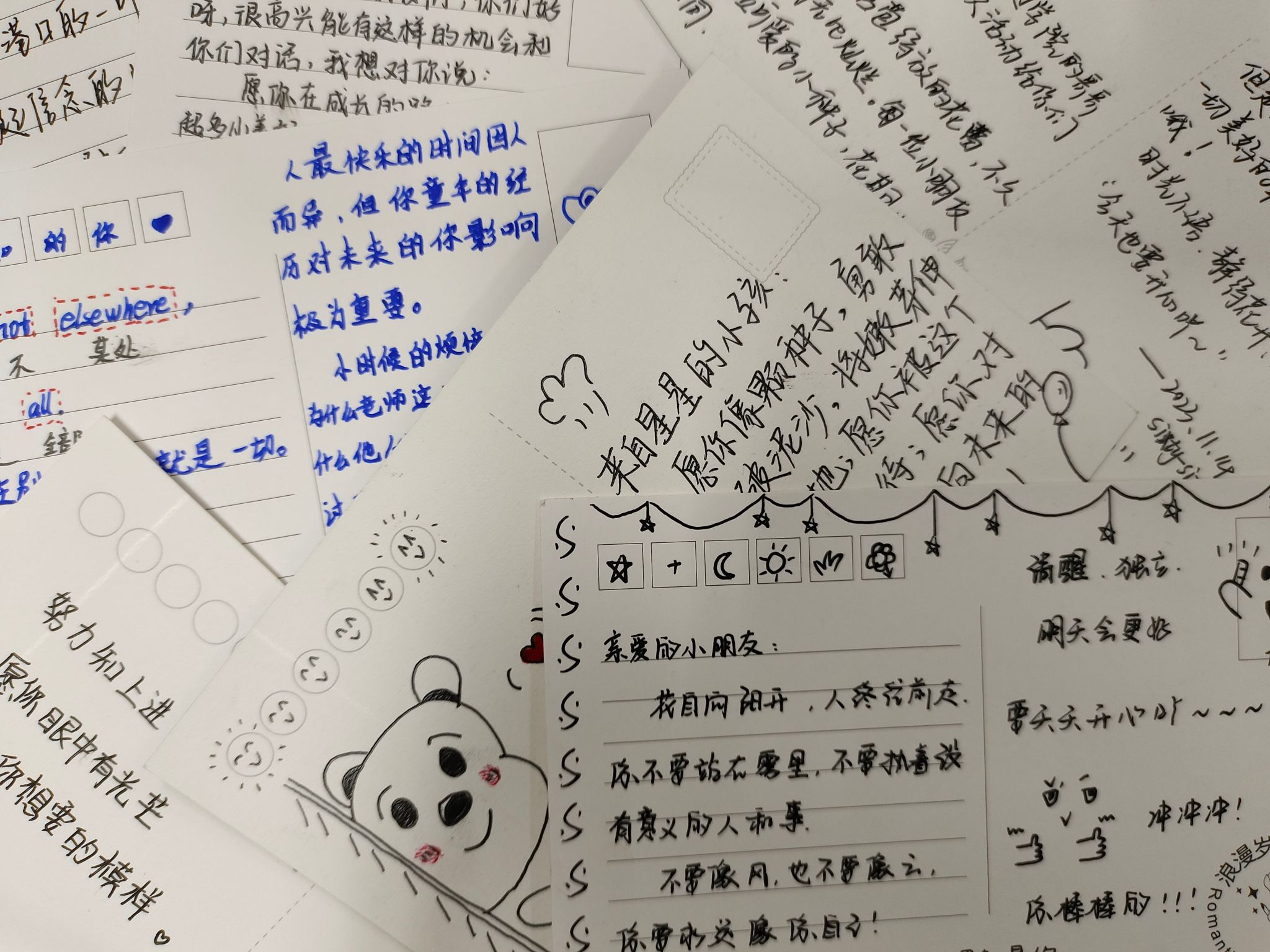 当看见同学们握紧笔,深思熟虑过后稳稳的落下,一笔一划坚定的写下自己对小朋友的殷切希望与自己人生道路上的小小建议。