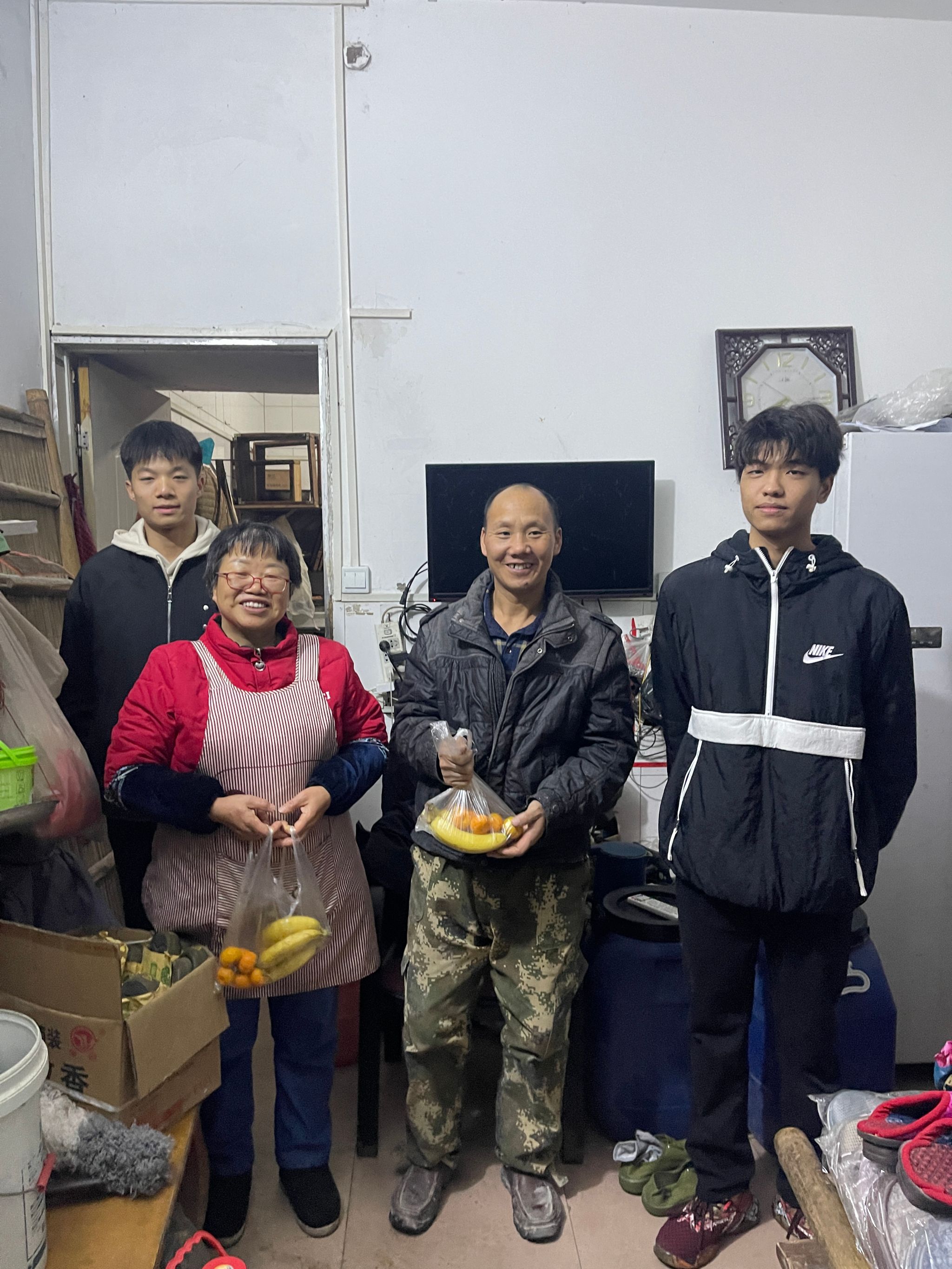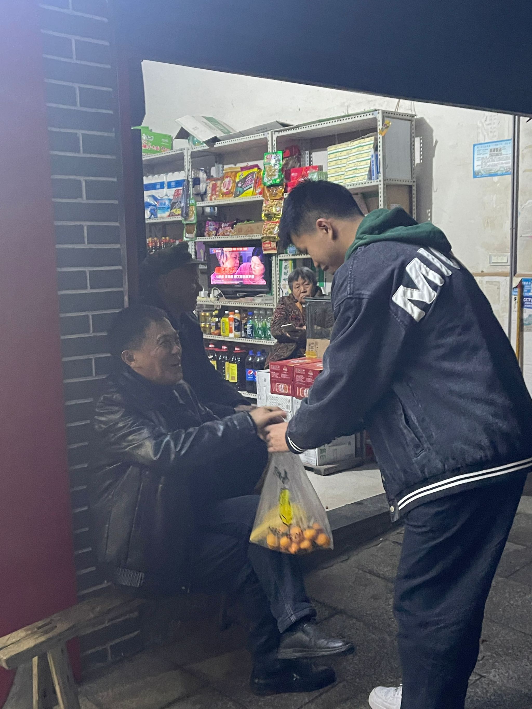 11月14日晚上七点,志愿者买了10斤橘子和10斤香蕉前往学校对面的小镇。道路两边,三五个老年人围坐在一起,唠着自己年轻时的英勇事迹,家里的青壮年都外出打工,留下了年迈的父母在小镇上,望着自家孩子离去的方向。