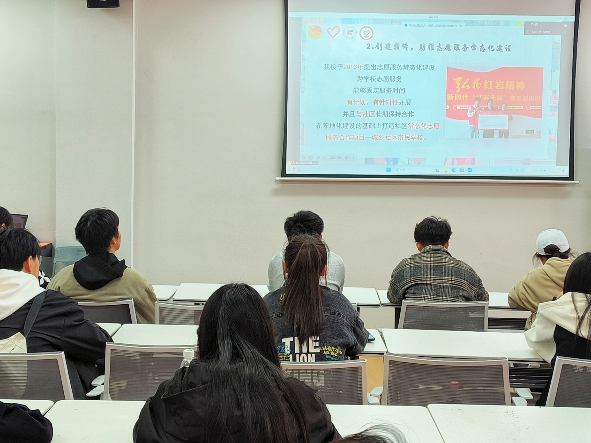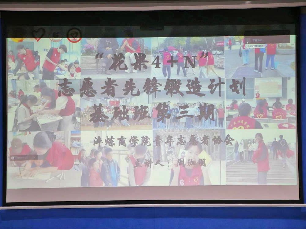 为让商院学子了解淬炼商学院青年志愿者协会志愿服务专项支队,呼吁组织商院学子参与到志愿服务活动中,将学习成果转化为志愿服务动能,淬炼商学院青年志愿者协会于2023年11月17日中午在合川校区的天空书院长空报告厅和綦江校区玉棠书院扎堆朋辈空间功能室联动开展了“花果4+N”志愿者先锋锻造计划基础班第三期,本次培训会议由淬炼商学院青年志愿者协会干部周珈羽同学主讲,由淬炼商学院青年志愿者协会双校区干事、2023级班团负责人共同参与。