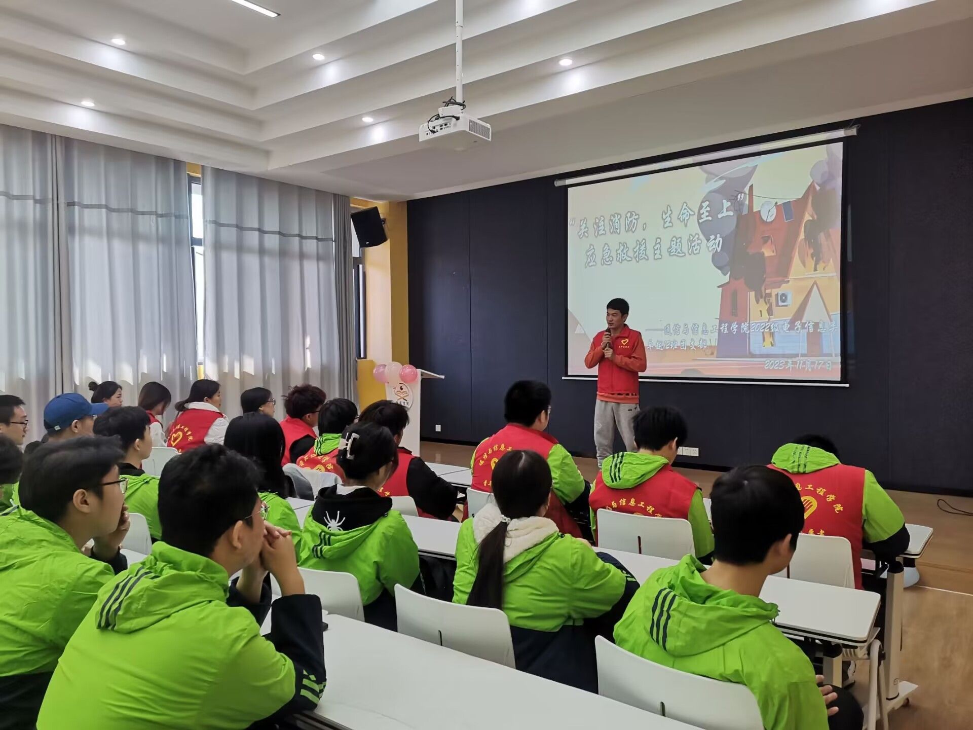 消防安全无小事,时时处处需留心。为了提高青少年的消防安全意识,学习掌握防火安全常识,增强逃生技能,养成良好习惯,能够保护自己的生命财产安全,防范于未“燃”。2023年11月17日2022级通信与信息工程学院电子信息类12班团支部在玉棠书院Talk king演讲中心举办“关注消防,生命至上”最热公益志愿服务活动。此次活动参与人数37余人,活动受益人数70余人。