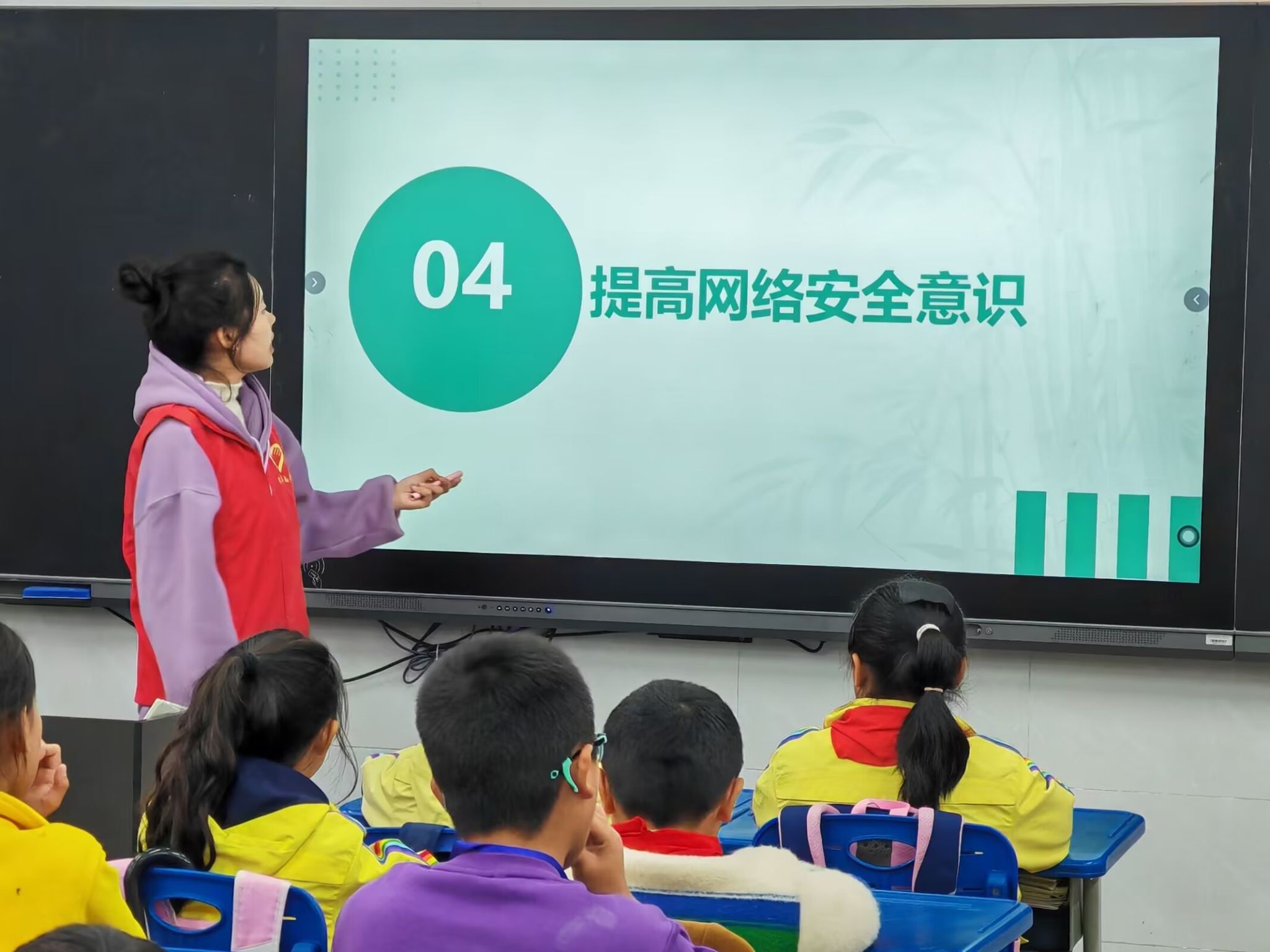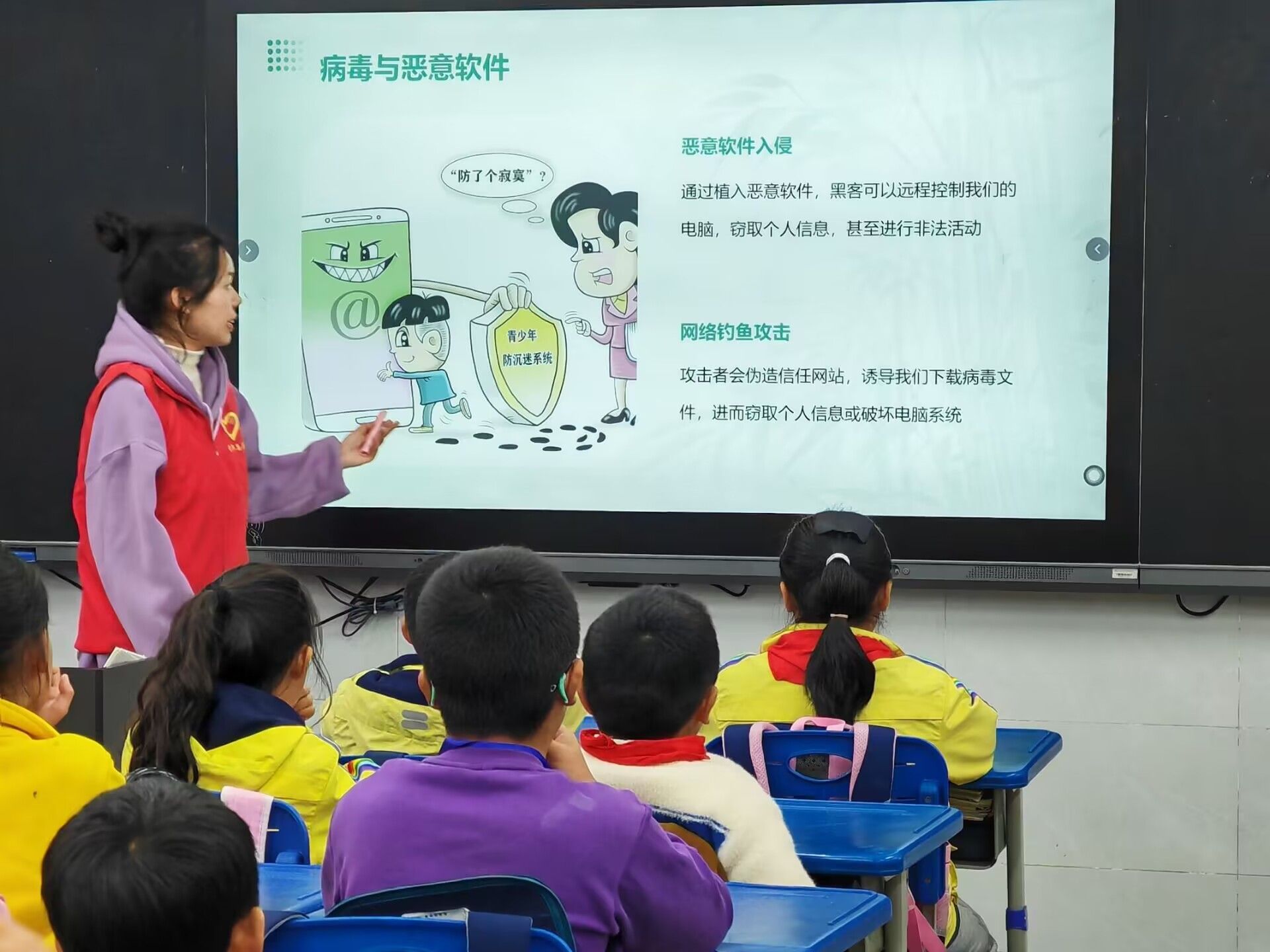 活动伊始, 志愿者们有序的进入教室,与小朋友热情的打招呼,随后由主讲人通过讲解ppt向小朋友们普及网络安全知识,并结合生活实际,提醒小朋友们在享用其便利的同时也要警惕安全隐患,在日常生活中要增强网络安全意识,学会辨别网络诈骗,避免掉入网络诈骗的陷阱。