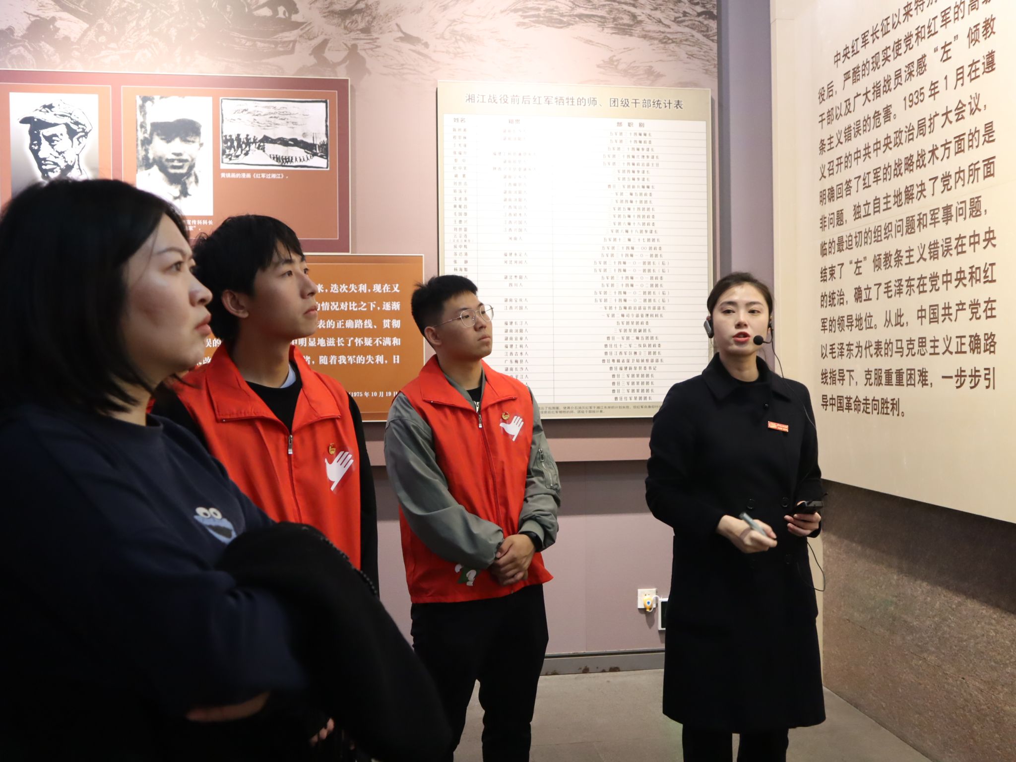 “湘江之战,红军虽突破了国民党军设置的第四道封锁线,但付出了极其惨重的代价。危急关头,毛泽东提出中央红军放弃北上、向敌军力量比较薄弱的贵州转移的建议,经过激烈的讨论,长征至此开始。”讲解员说道。展示台用红色的线条光芒将红军长征的路线展示了出来,讲解员一一解释着每一条路线的方向,并向宣讲团展示这些路线的由来。宣讲团的成员们看着这一条条红色的痕迹,看着红军艰难的爬雪山、过草地,心里一阵热意翻涌。