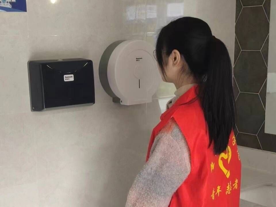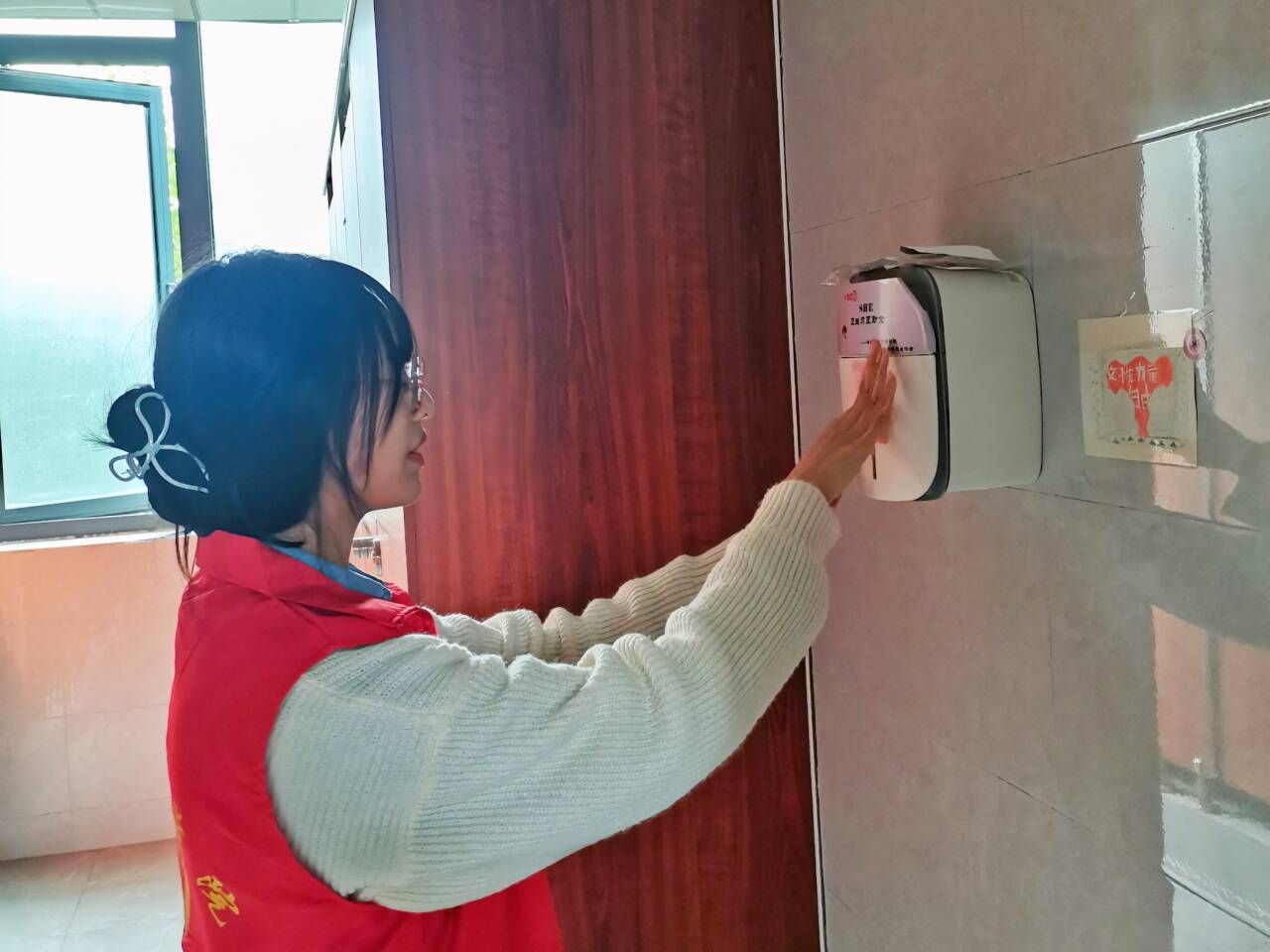 在补充卫生巾的同时,志愿者们对卫生巾互助盒进行了仔细地检查及打扫。面对互助盒损坏之处也都做出了相应的修补。在互助盒检查中“SHE”关爱女性志愿服务专项支队的支队长梁瑜也表示到“后续会加大对互助盒检查次数,争取做到一周一检查,及时保护,避免过度损坏”。此次互助盒的检查也为后续卫生巾互助盒的更换提供了建设性的建议。而奔走在各教学楼和书院间的志愿者们,也成为了学校一道靓丽的风景线。