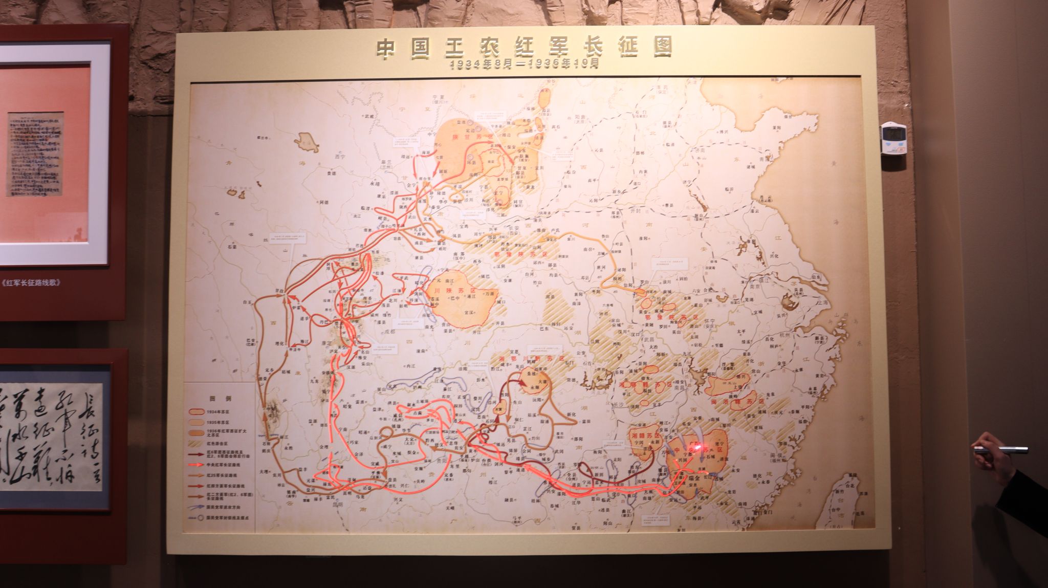 雄关漫道真如铁,而今迈步从头越。“湘江之战,红军虽突破了国民党军设置的第四道封锁线,但付出了极其惨重的代价。危急关头,毛泽东提出中央红军放弃北上、向敌军力量比较薄弱的贵州转移的建议,经过激烈的讨论,长征至此开始。”讲解员说道。展示台用红色的线条光芒将红军长征的路线展示了出来,讲解员解释每一条路线的方向,并向宣讲团展示这些路线的由来。宣讲团的成员们看着这一条条红色的痕迹,看着红军艰难的爬雪山、过草地,心里一阵热意翻涌。