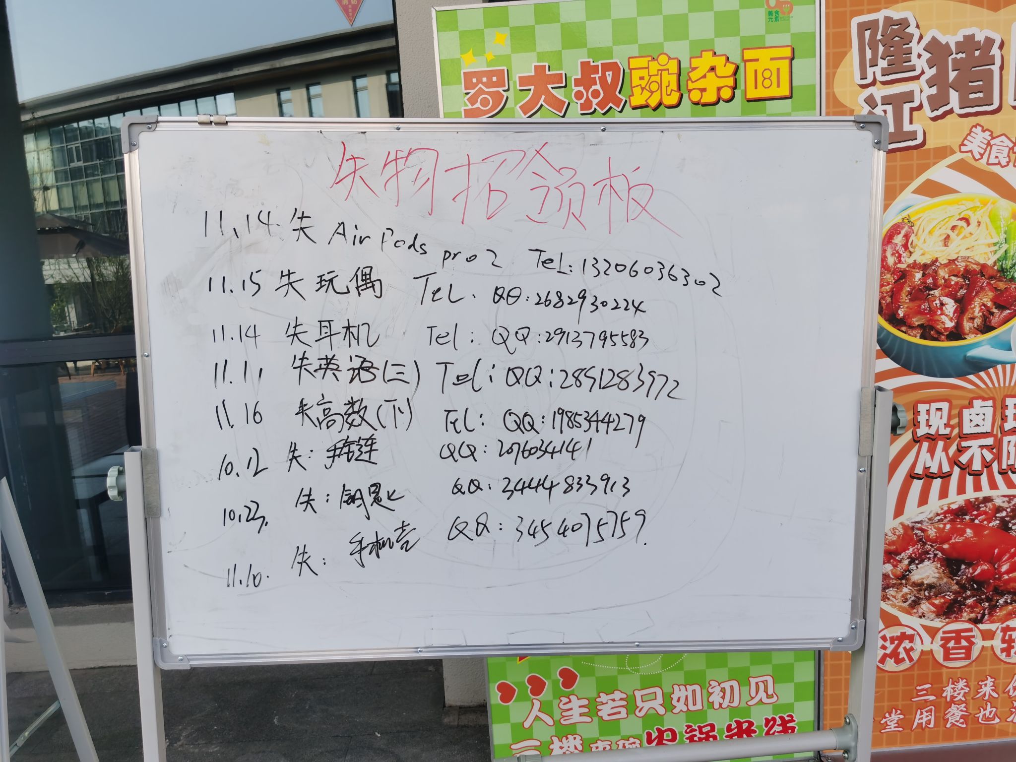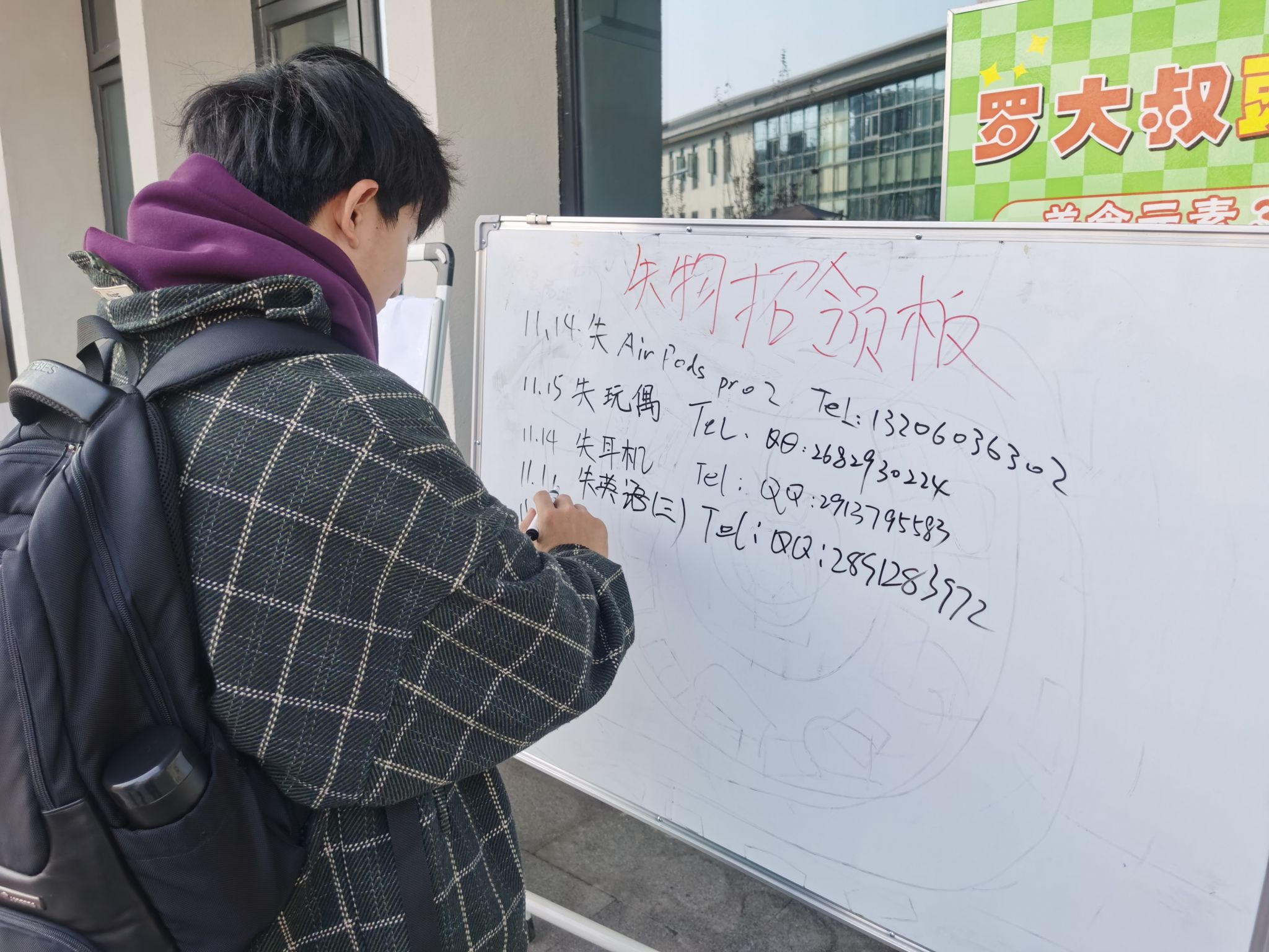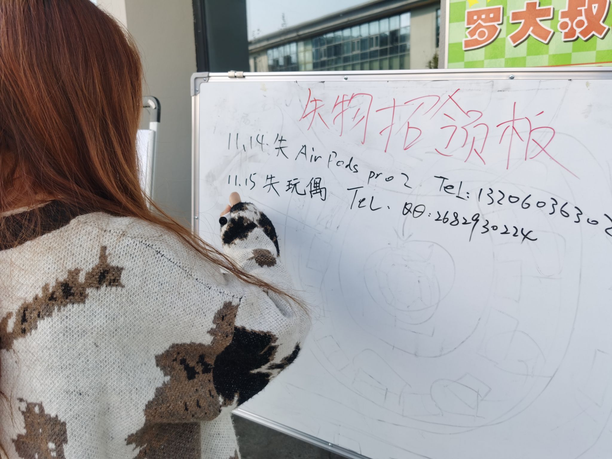 为了帮助同学们找回自己丢失的物品,提高同学们对物品的保管意识和拾金不昧的精神,造就美好和谐的完满校园。我们此次选用一种特殊的工具帮助我们来实现这一目的,它就是双面白板。双面白板,顾名思义,它具有两个表面,这种设备以其独特的特性,赋予了我们一种全新的活动方式,让我们看到了“双面人生”的可能性。2023年11月15日至19日,送“我”回家·失物招领志愿服务专项支队与大数据学院宣传调研部在各食堂门口,共同联合举办了一场独具特色的“双面白板的双面人生”活动。此次活动旨在通过设立特别的白板,帮助同学们找回丢失的物品,并增加同学们之间的互动,丰富校园生活。
