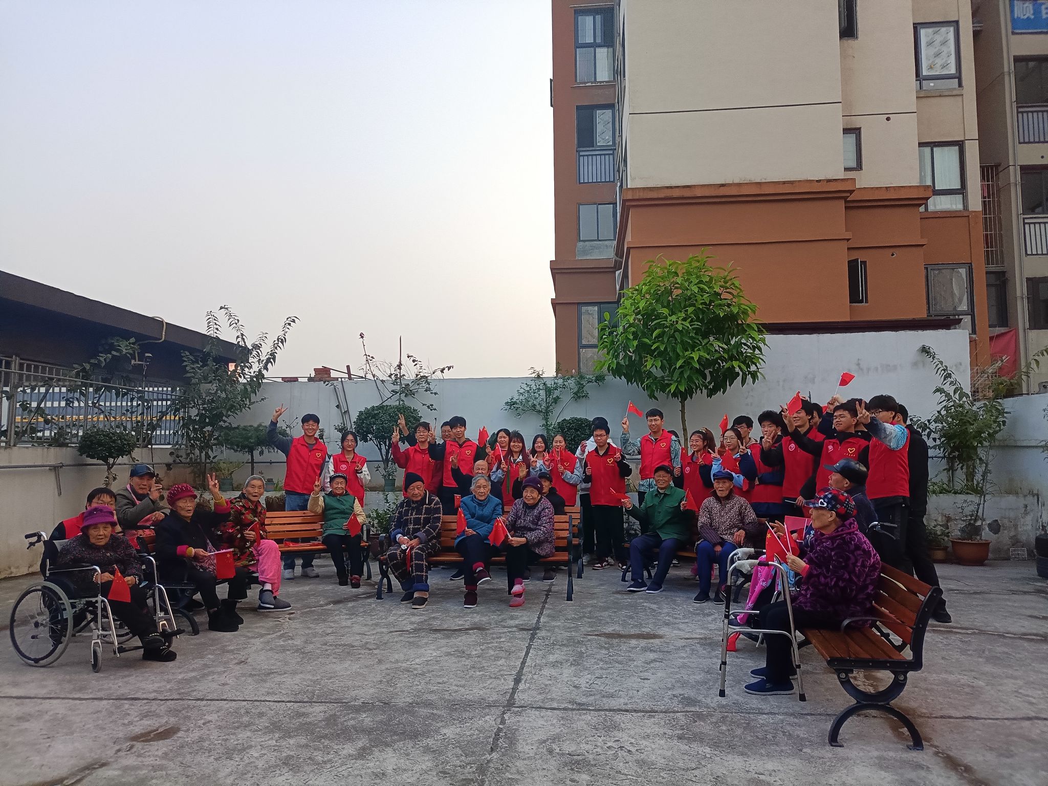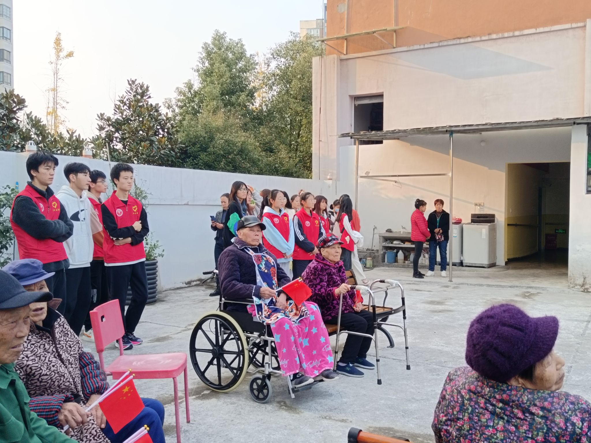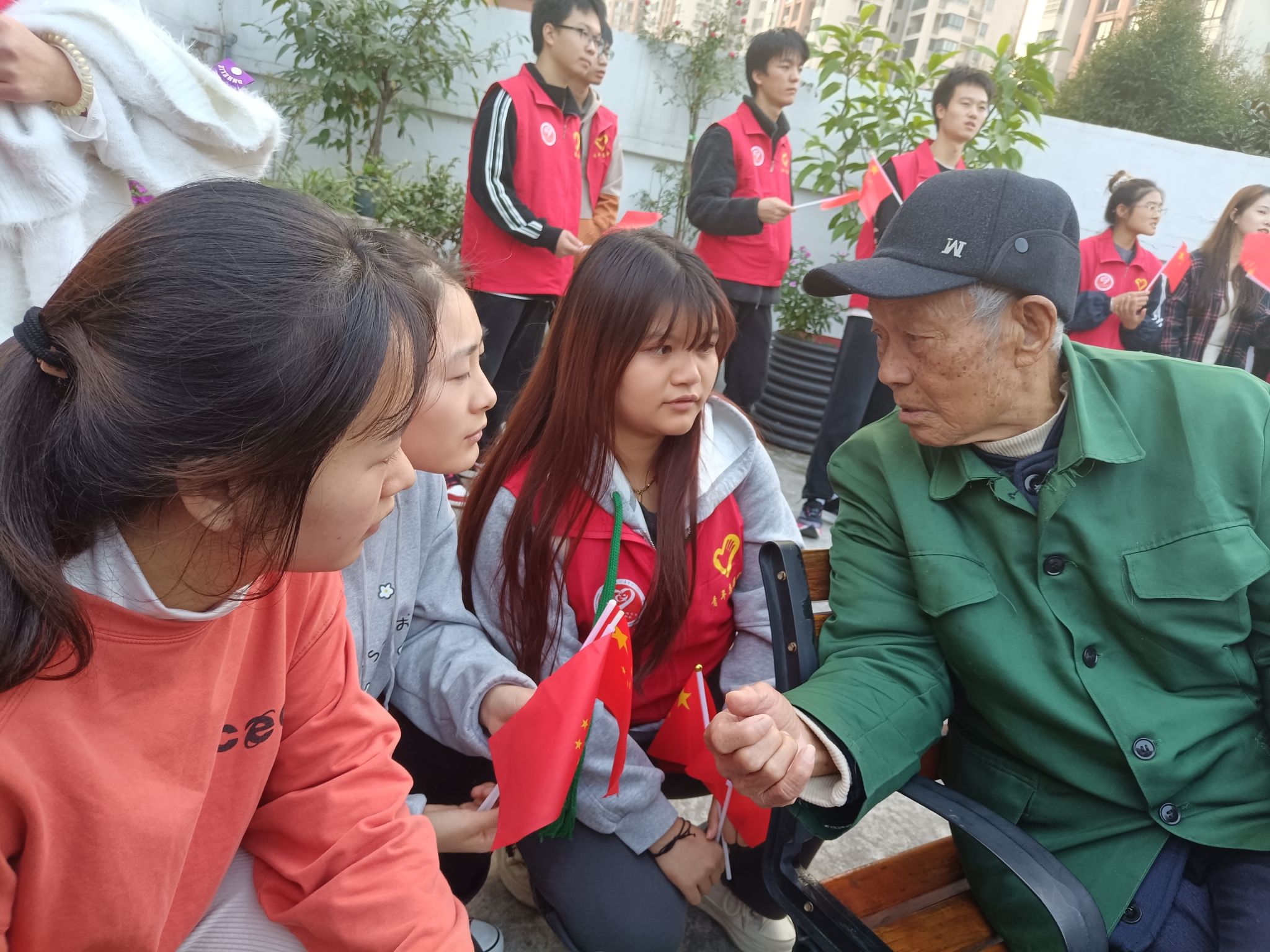 在志愿者们们陈述完毕后,为舒缓老年人心中的孤独感,电子信息类14班和16班的志愿者们在庭院中与老人们进行了进一步的交流,志愿者在耐心倾听的同时,细心记录老人所谈及的过往,并将故事串成集组成最美好的回忆。空白页上的一撇一捺,描绘着老人的点滴故事,平凡的语句拼凑着从前生活的不易。