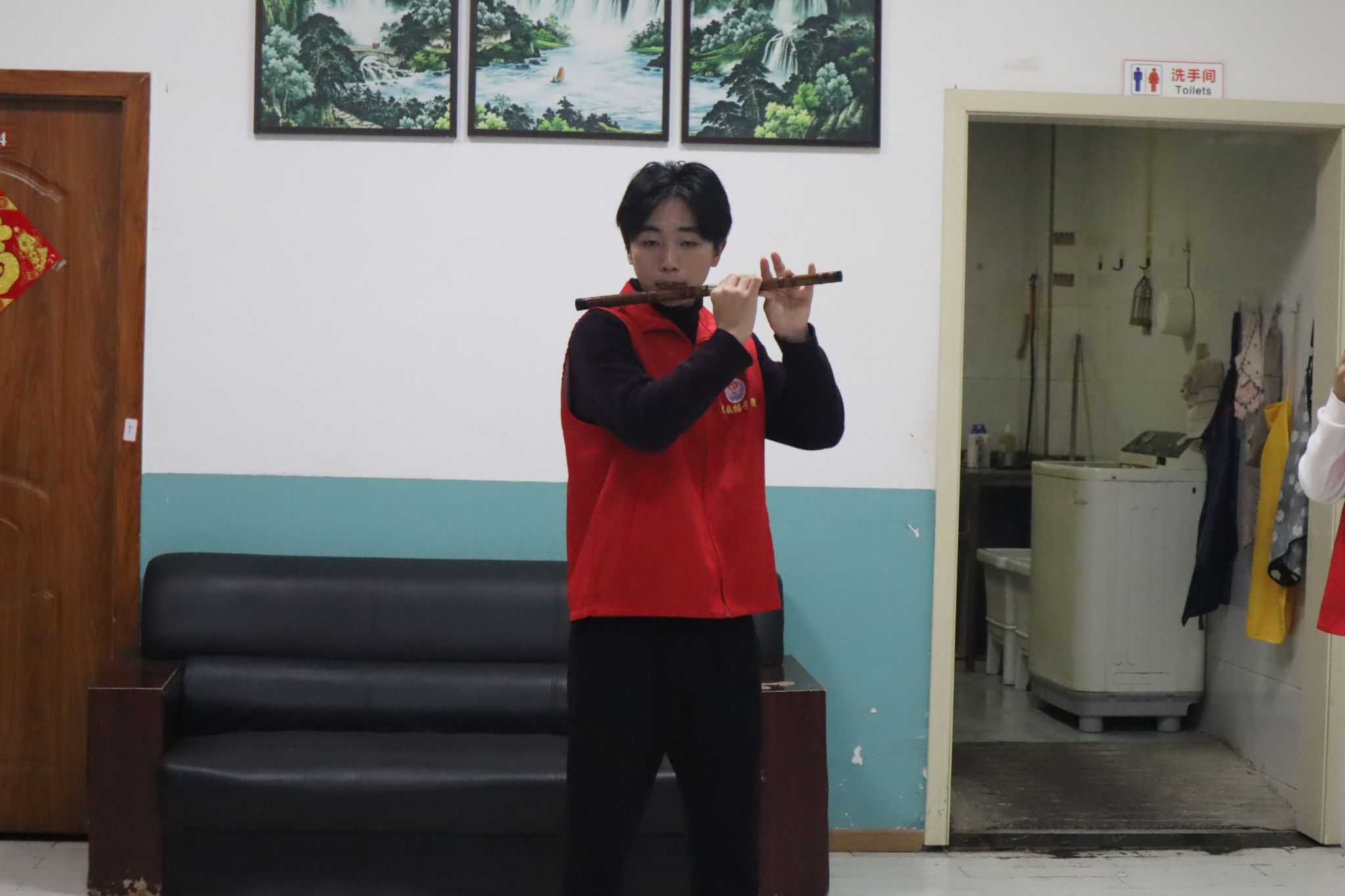 紧接着,由志愿者同学进行《强军战歌》合唱表演,铿锵有力的声音充满激情的干劲,振奋人心的战歌让老人们也忍不住跟着唱了起来。不仅如此,志愿者张继林施展才艺进行吹笛演奏,他以一首《妈妈的吻》为笛子曲目,动听的旋律,让在场志愿者及老人们也沉迷其中。