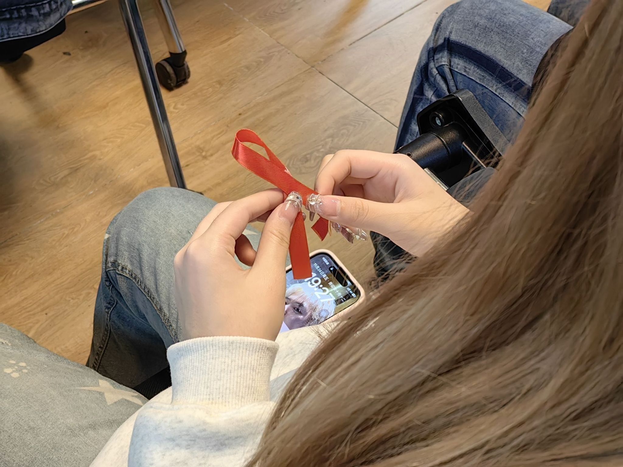 唯有真情,可使关爱传递。红丝带并不仅仅只是一个简单的标志,通过亲手制作红丝带让同学们深刻体会红丝带背后的含义:它代表着关心,用来表示我们对HIV和艾滋病的关心,关心那些受艾滋病影响的人;它是一种希望的象征,象征疫苗的研究和治疗感染者的成功,象征HIV感染者生活质量的提高;它代表着支持,支持HIV感染者,支持对未感染者的继续教育,支持尽全力去寻找有效的治疗方法、疫苗,支持那些因艾滋病失去至爱亲朋的人。借用红丝带作媒介,向艾滋病患者表达我们最真挚的关爱。望所有人摘下对艾滋病人的偏见与歧视,让他们收获更多的友爱与支持。