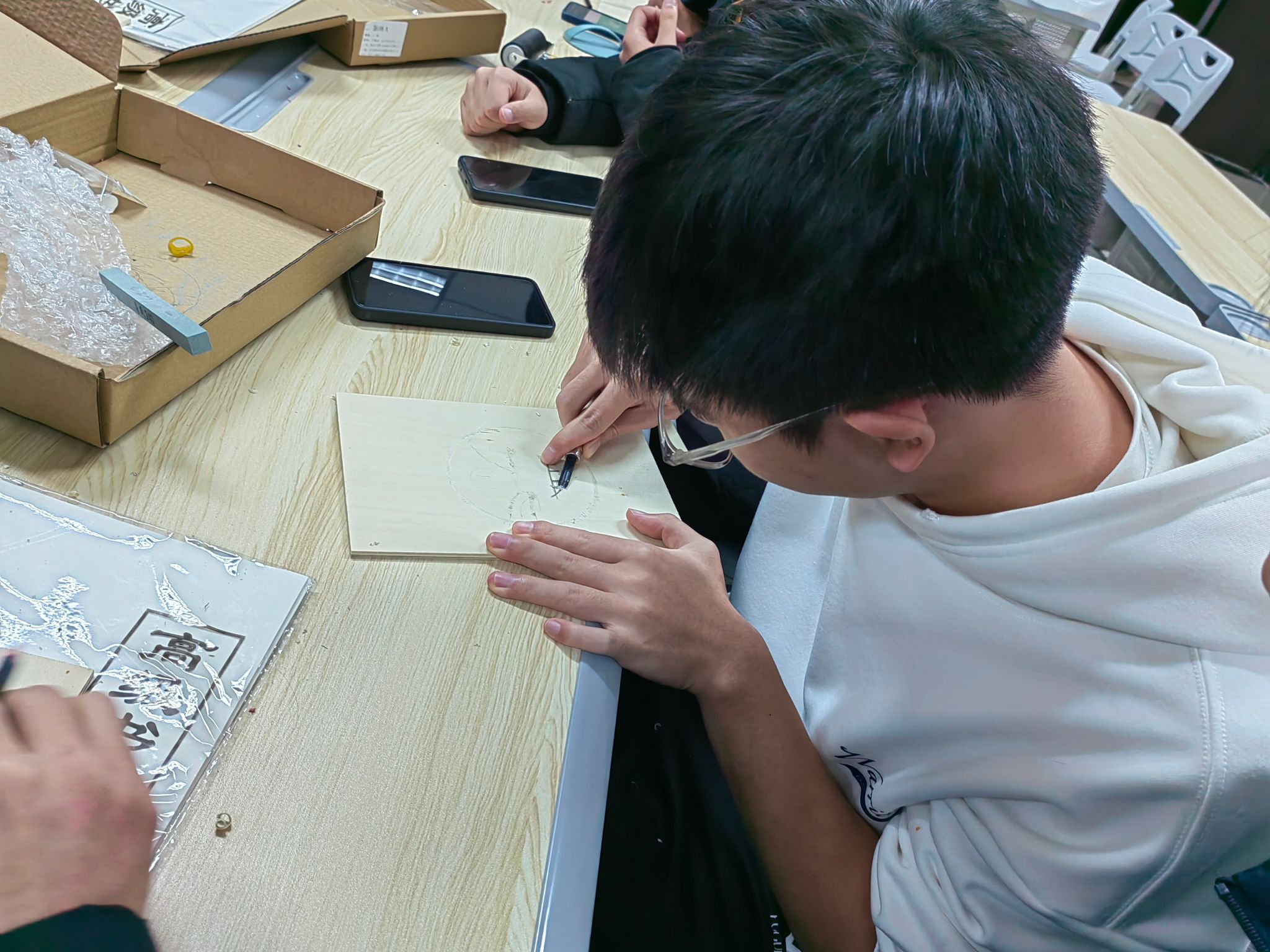 接下来是同学们所期待的实践环节,同学们亲自体验了版画制作的整个过程——从选题、设计、刻板到印刷,同学们一步步感受着版画的独特魅力。虽然在过程中遇到了不少困难,但同学们都坚持不懈,充分发挥了自己的创造力和团队协作精神。最后是一幅幅富有创意的版画作品呈现在大家面前。