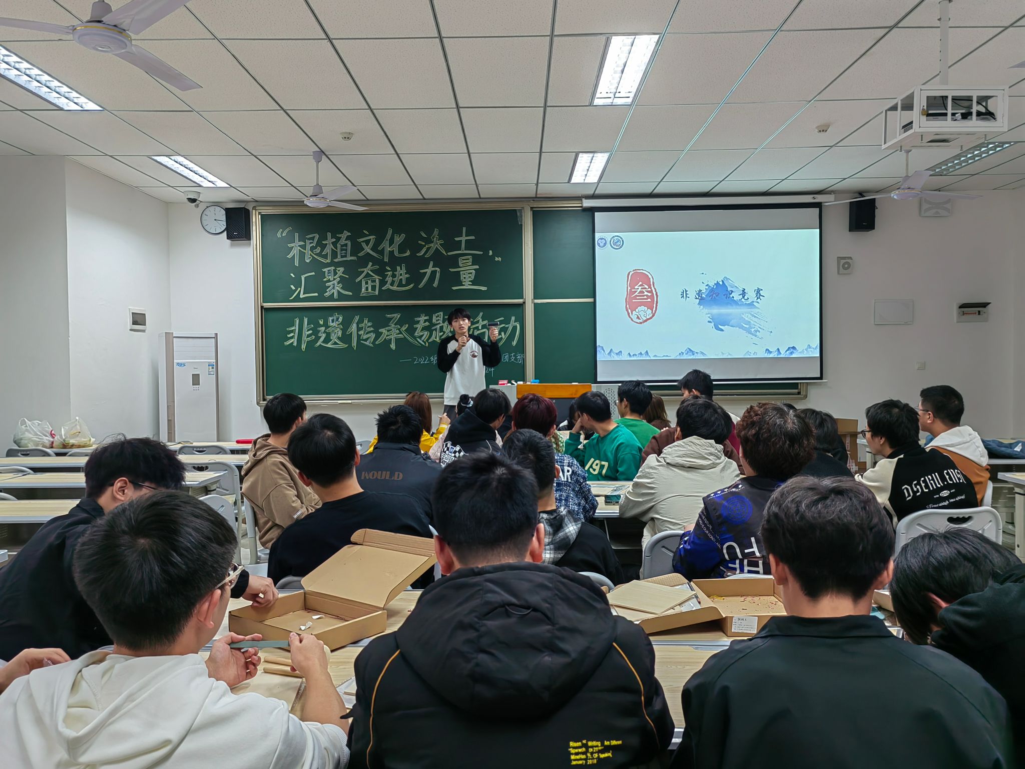 且过午后,上午未能参观版画院的同学早已翘首以盼。下午两点时分活动正式开始,首先由版画院的工作人员为同学们讲解版画的相关知识,台上的认真讲解,台下的同学全神贯注的聆听。讲解结束后便进行有关非遗文化的有奖问答,“题目在卖着关子”而同学们在蠢蠢欲动,这一环节火热而由短暂,题目抛完之后,获奖的同学满脸笑意,没有获奖的同学,表情虽有不甘,但更多的是“下次一定行”,环节紧密相扣,下一个亦随之而来