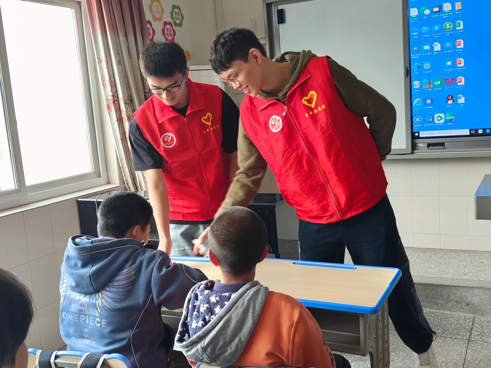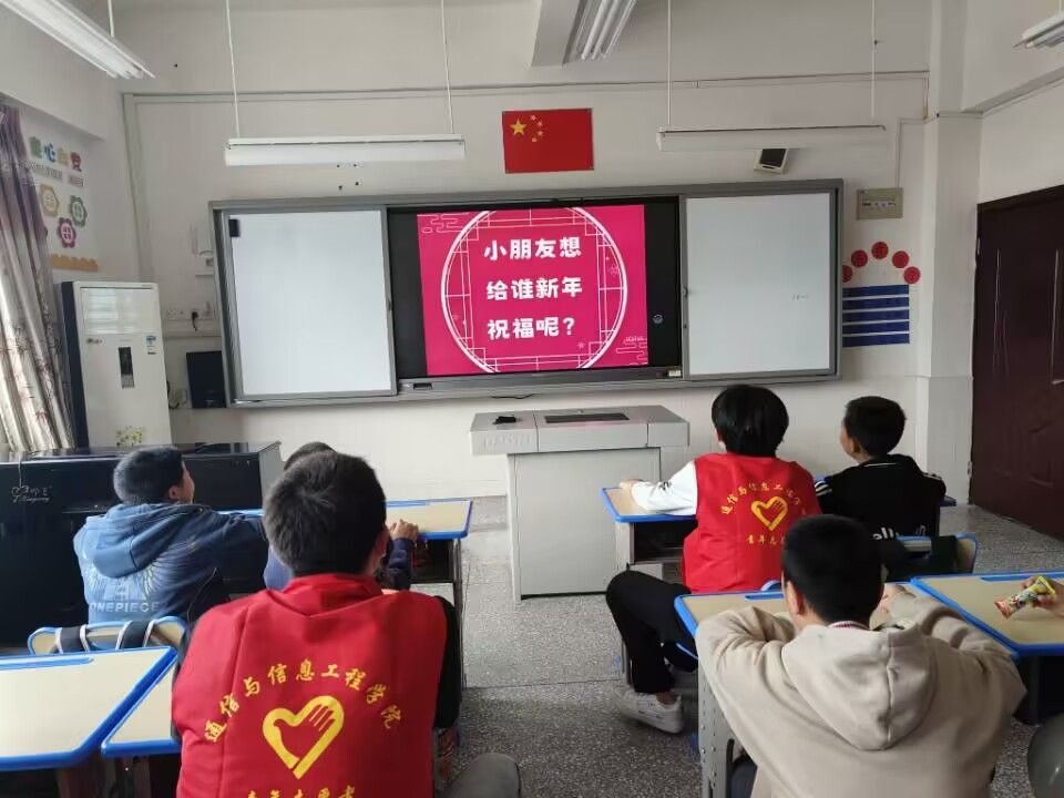 “小朋友们,大家好啊。志愿者们初次和小朋友们见面时,小朋友们都还有些许羞涩,不过在经过了看过了自我介绍以及精心准备的迎新年动画视频之后,同学们成功和孩子们打成了一片。