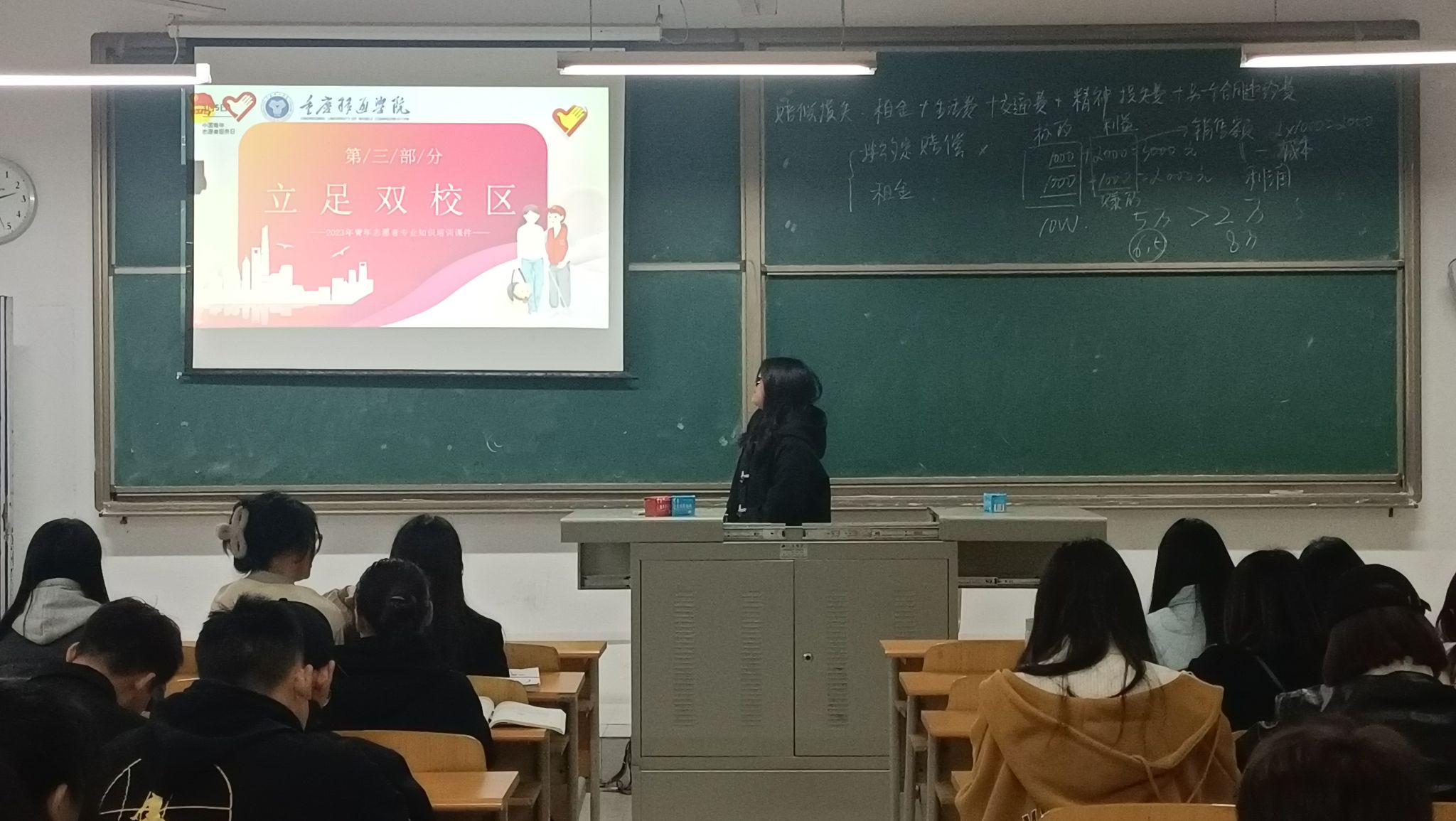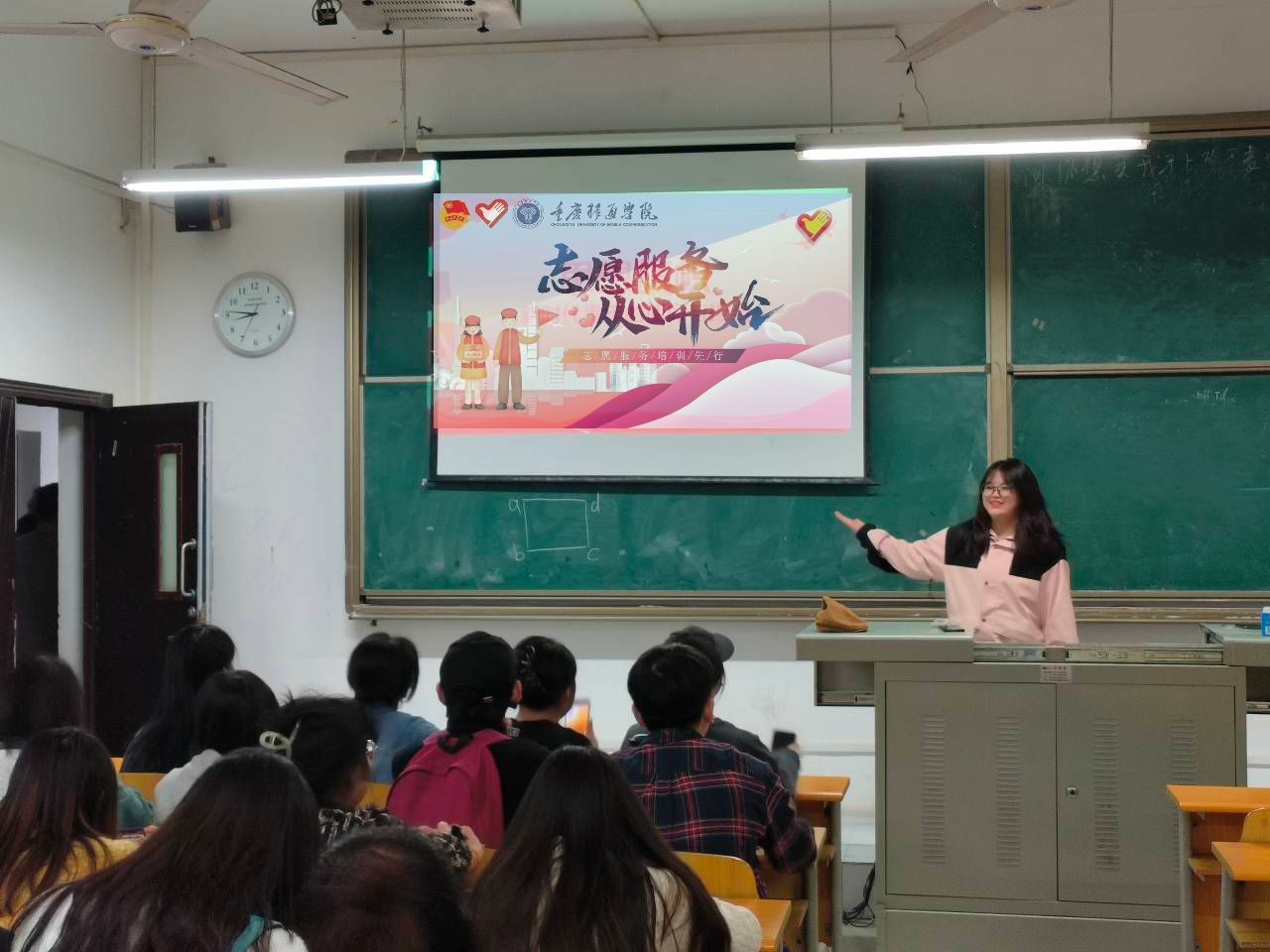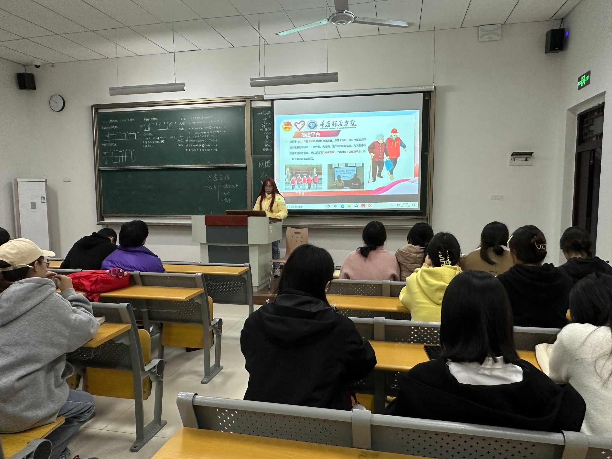 2023年11月26日,重庆移通学院淬炼商学院青年志愿者协会携2023级工商管理专升本9-11班、市场营销专升本2班全体同学于1210教室开展了以“志愿服务·从心开始”为主题的宣讲会。本次活动旨在传承志愿服务精神,弘扬乐于奉献的优良传统。向同学们传递志愿服务重要性的同时,鼓励同学们积极参与志愿服务活动。