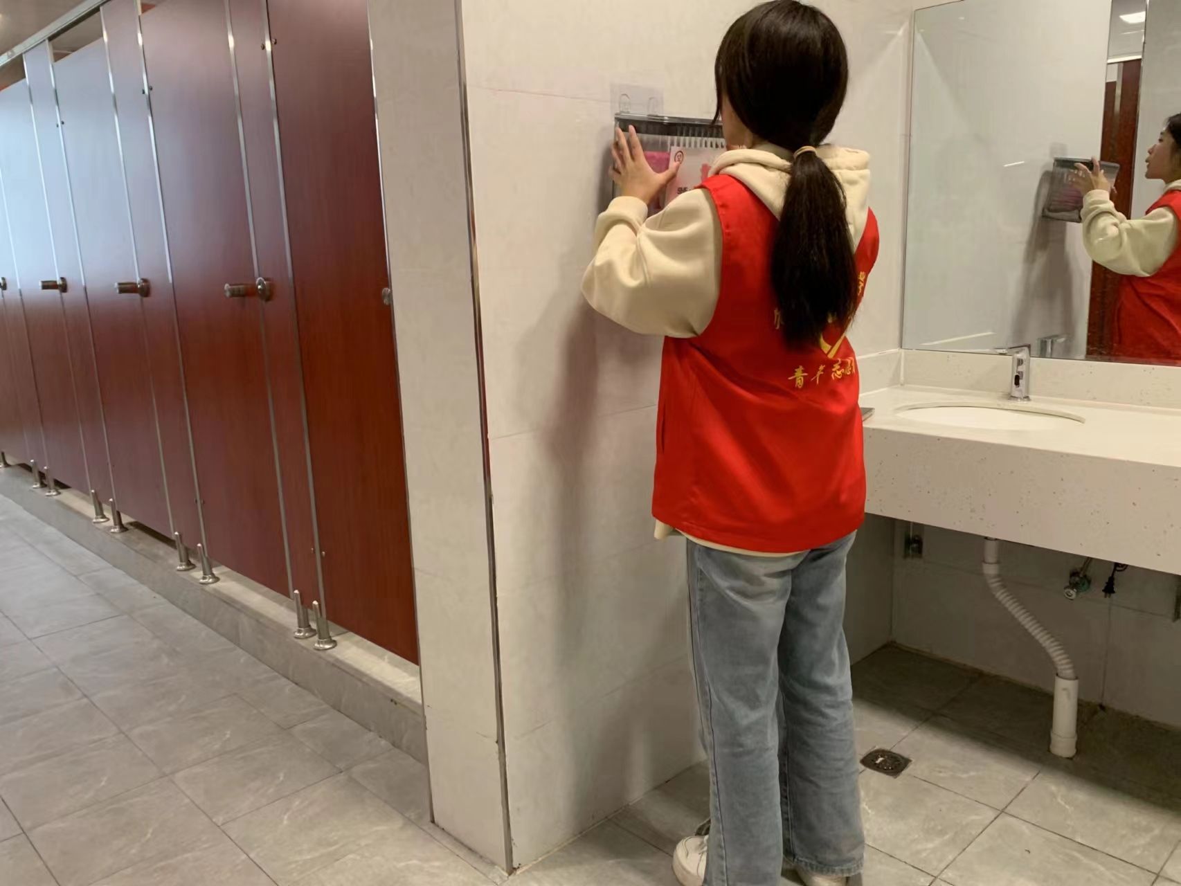 活动过程中,各位志愿者们将大量卫生巾投放到学校各个女生厕所,并贴心地设置了专门的卫生巾互助盒,确保女生们在需要时能够方便地获取到卫生巾。志愿者们用热心传递温暖,为学校的卫生环境贡献自己的一份力量,一片小小的卫生巾,带来的温暖,是女性间的善意。