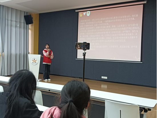 “青春是我们的名片,服务是我们的志愿。”主讲人通过向同学们讲解了“什么是西部计划”“西部计划政策保障”“报考条件”“为什么要报考西部计划”,从不同的方面分析西部计划,多层次宣传志愿精神。以视频的形式展现当代大学生投入西部计划的所感所想,呈现西部计划取得的成果,让同学们了解西部计划的成就,从而理解志愿到西部的意义。通过西部计划七个专项具体服务内容,志愿让同学们了解了志愿服务对西部地区建设的重要性,感受到当地人对志愿服务的支持,提高了志愿者从中获得的幸福感。
