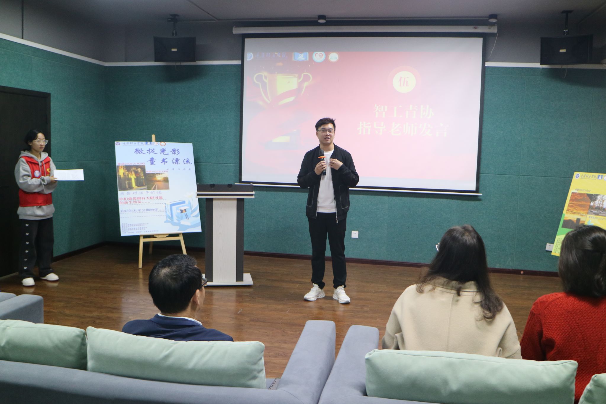 紧接着便是激动人心的颁奖时刻,主持人上台宣布获奖者人员名单,获奖者上台领奖并与颁奖嘉宾合影留念,活动最后,智能工程学院青年志愿者协会指导老师陈林做活动总结,陈老师说道此次活动时间很长,很高兴同学们坚持到了最后,也希望同学们在日后的生活中能多关注留守儿童,尽自己所能为他们送去温暖。本次活动对优秀作品的参赛选手颁发相应的证书、给予一定的奖励,还以获奖选手个人名义向陕西岚皋县孟石岭镇柏杨小学捐赠书籍,总共累计捐赠故事类书籍370余本。