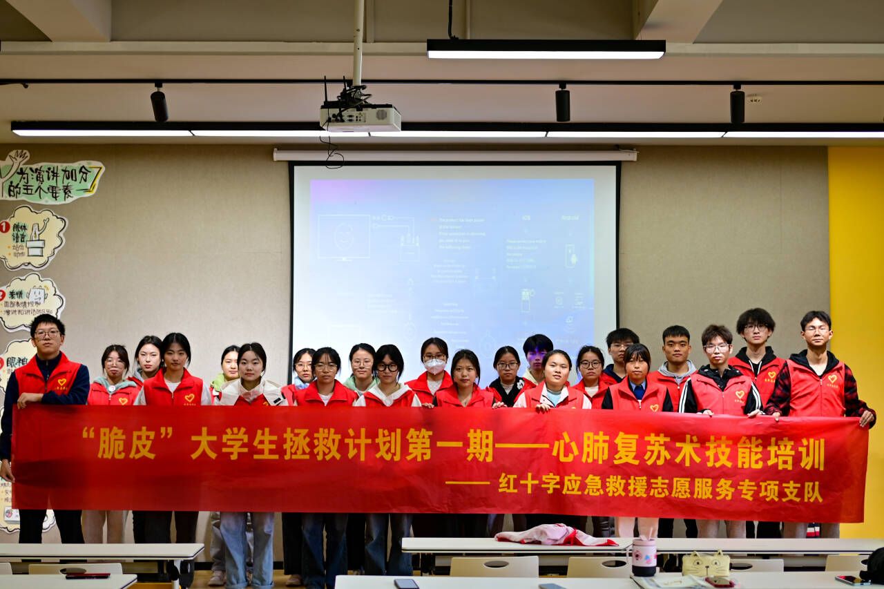 随着心血管疾病的发病率以及相关事件的突发状况增多,人们在实际情况中运用心肺复苏的次数也随之增多。在急救途中,由于缺乏专业知识的系统学习与实际练习,往往会发生因救助不当而导致二次受伤情况。为提高支队成员的应急救援能力,让新队员学习并掌握心肺复苏技能,让个人救援技术专业可靠。红十字应急救援志愿服务专项支队于11月26日下午14:00在瀛溪书院语者演讲培训室开展“脆皮”大学生拯救计划第一期——心肺复苏术技能培训。此次培训由支队长与小组长面向全体队员进行讲解培训,该活动共计20余人参与。