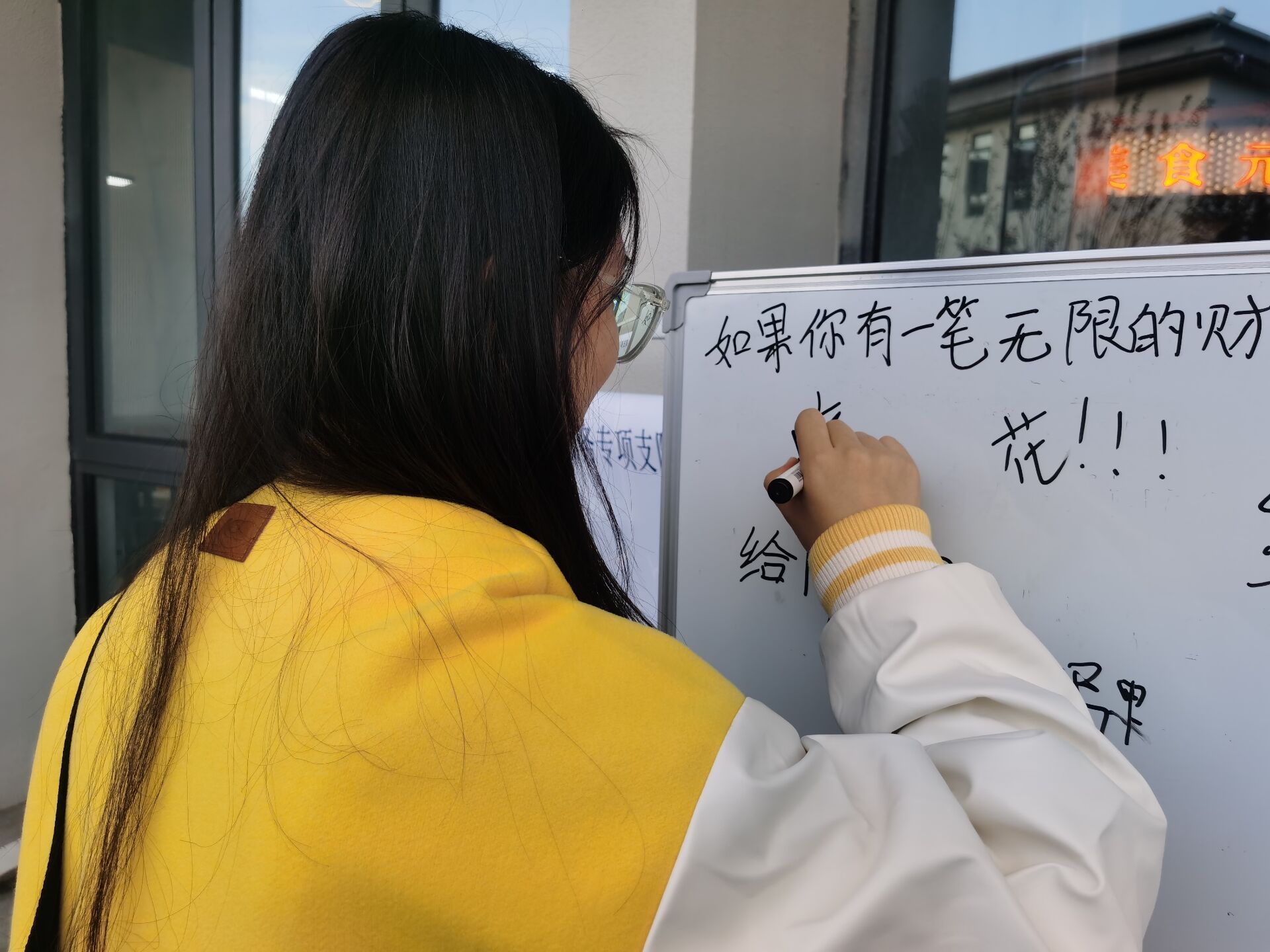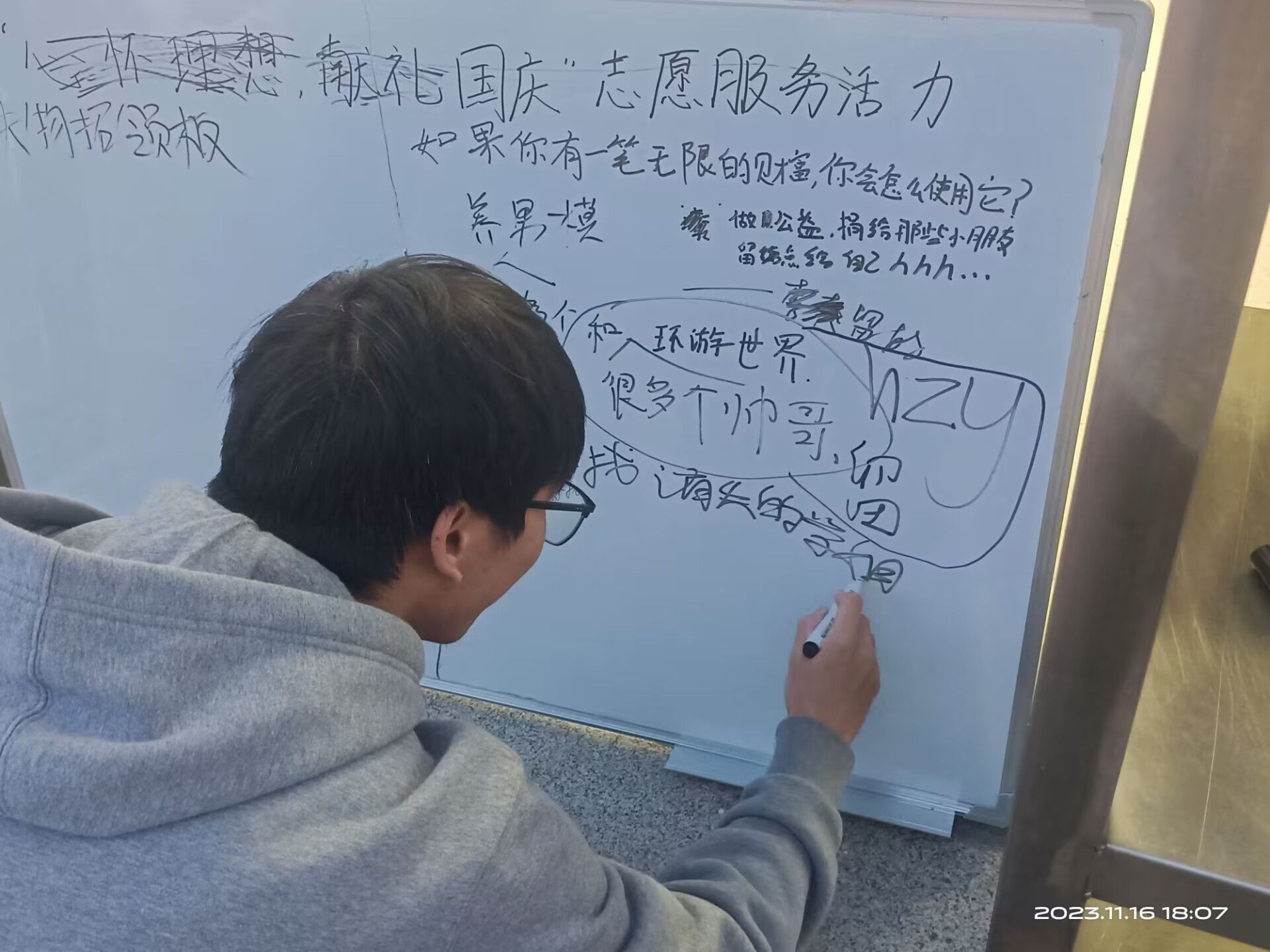 为了帮助同学们找回自己丢失的物品,提高同学们对物品的保管意识和拾金不昧的精神,造就美好和谐的完满校园。我们此次选用一种特殊的物品帮助我们来实现这一目的,它就是双面白板。双面白板,顾名思义,它具有两个表面,这种设备以其独特的特性,赋予了我们一种全新的活动方式,让我们看到了“双面人生”的可能性。2023年11月15日至19日,送“我”回家·失物招领志愿服务专项支队与大数据学院宣传调研部在各食堂门口,共同联合举办了一场独具特色的“双面白板的双面人生”活动。此次活动旨在通过设立特别的白板,帮助同学们找回丢失的物品,并增加同学们之间的互动,丰富校园生活。