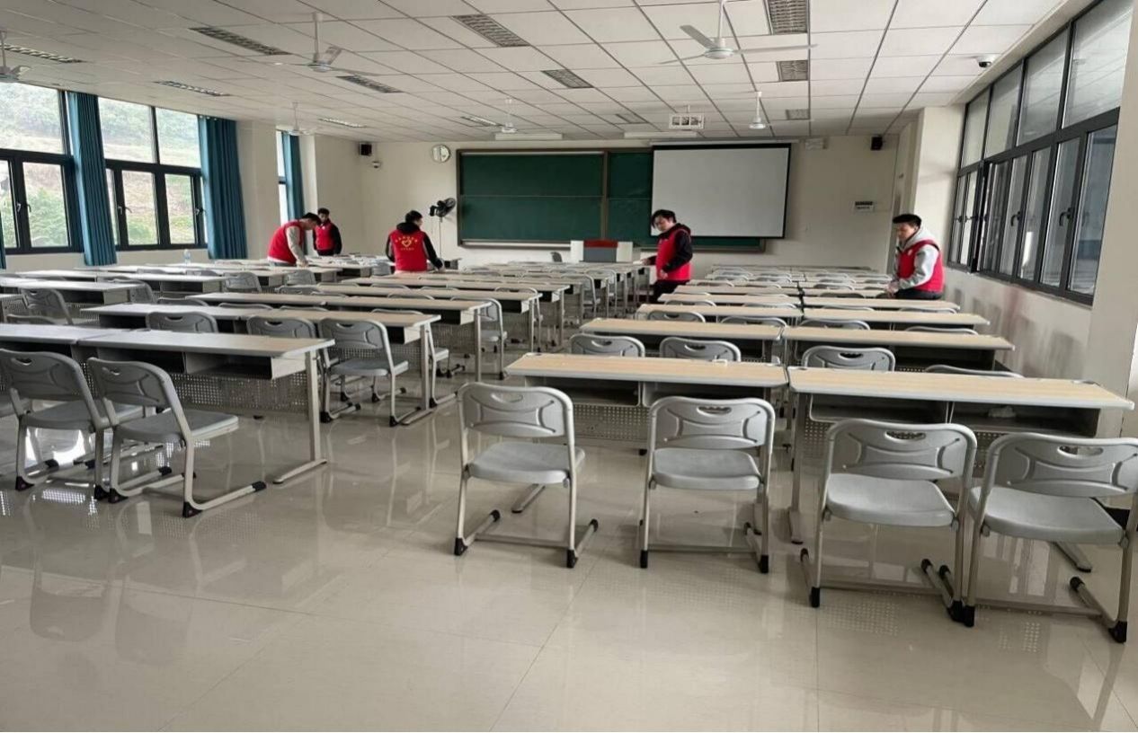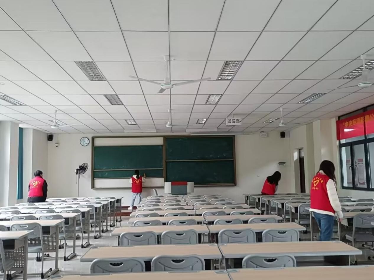 活动开始前,同学们穿上活动负责人准备的志愿者马甲,并戴上一次性手套,在活动负责人的安排下,志愿者们分为两组,每组五人进行教室卫生打扫。分好组后志愿者们就开始了清扫工作,将讲台整理好,并将黑板擦拭干净,同时把遗留在抽屉里的垃圾和桌面垃圾清理干净,把桌子、椅子排列整齐。恢复整洁的教室环境,为同学们带来了舒适的学习环境。