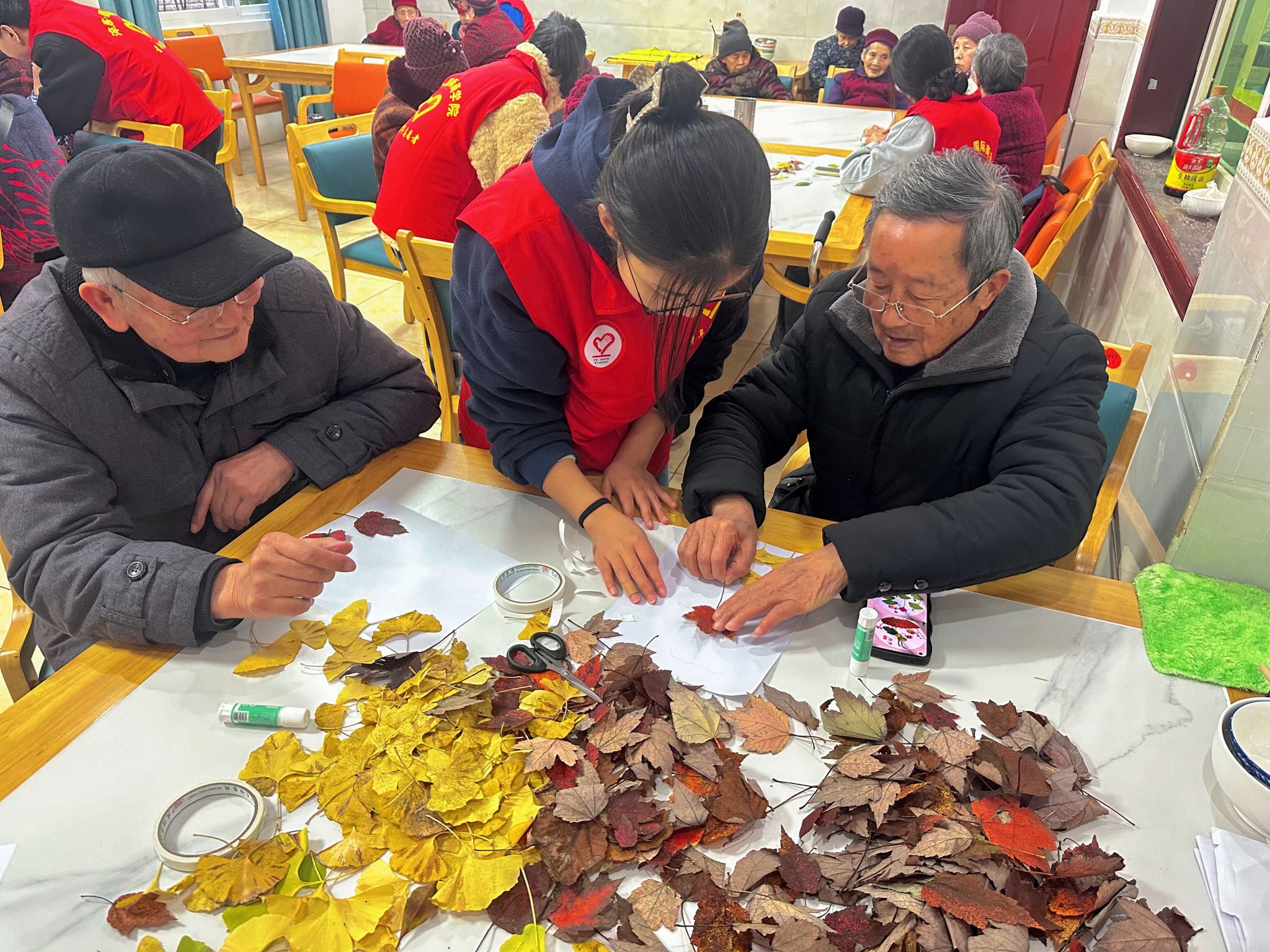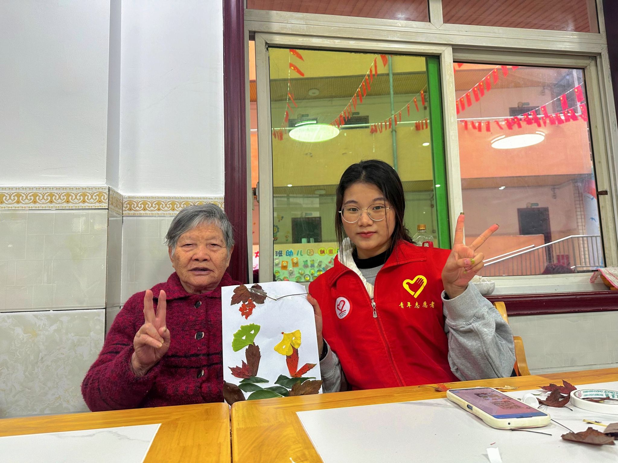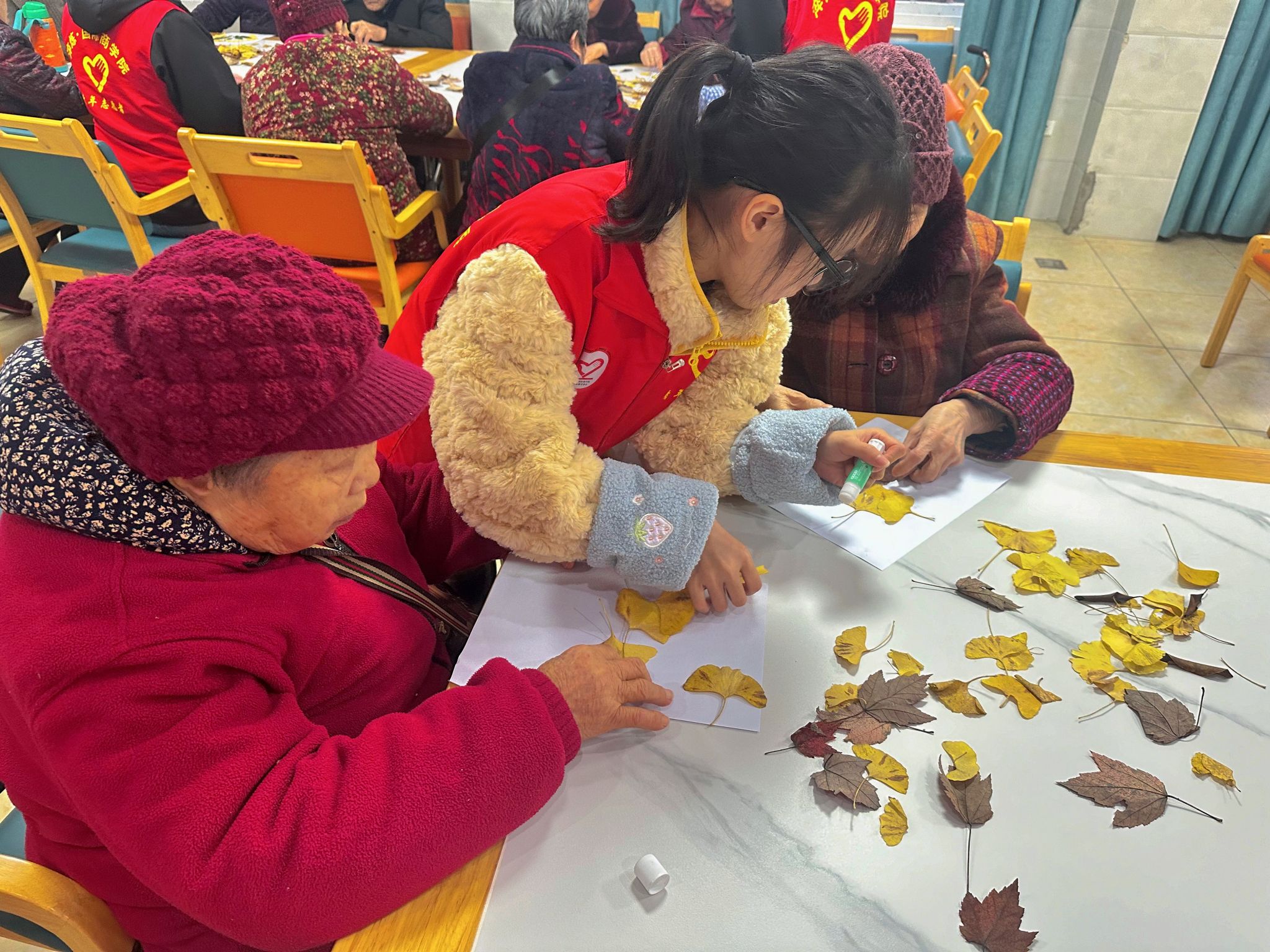 在寒意高涨的冬天里,为让老人们能感受到温暖。志愿者们特别组织了以落叶有画的活动,伴随着欢声笑语,老人们与志愿者有说有笑,一起进行落叶的画作。